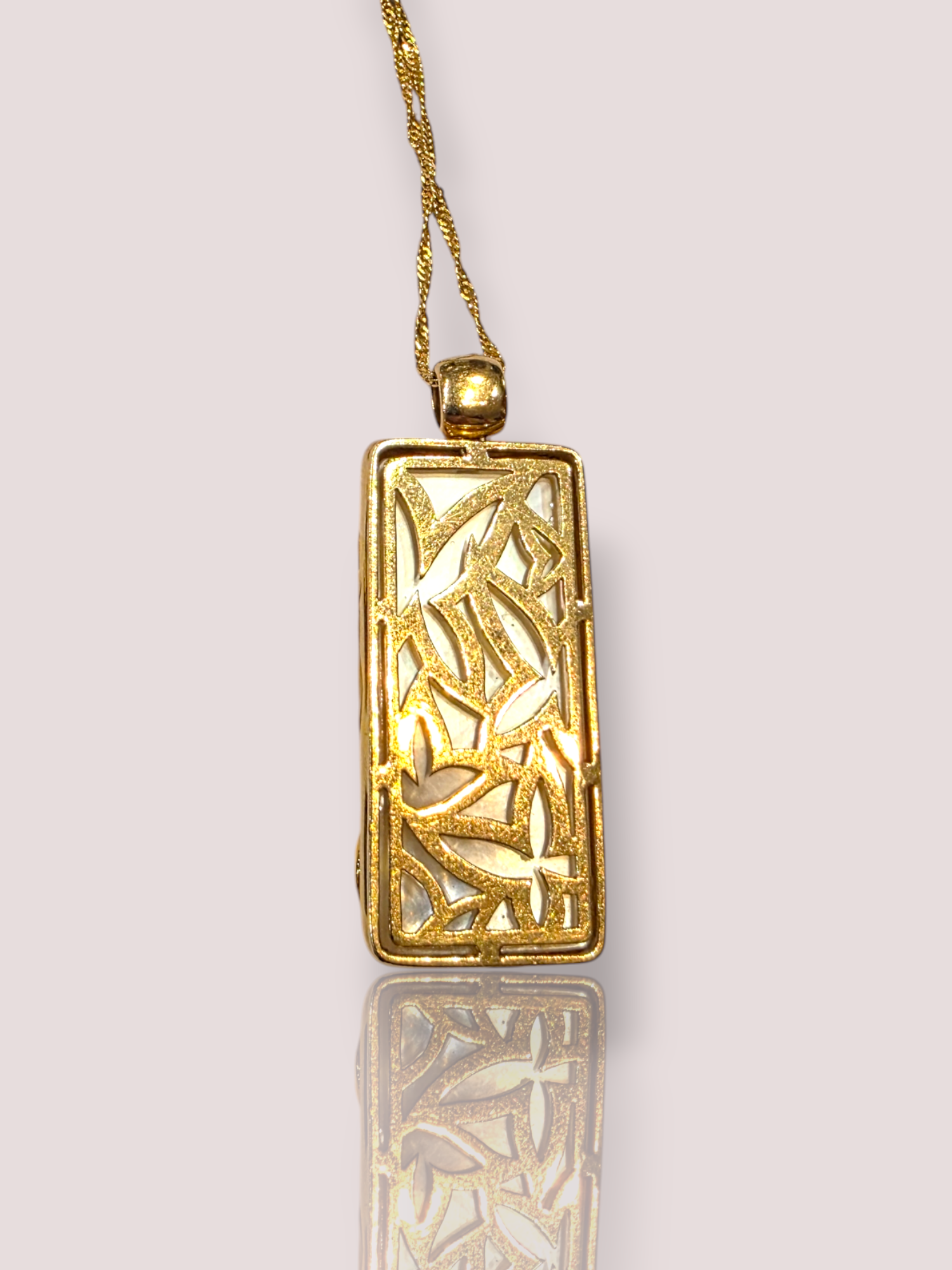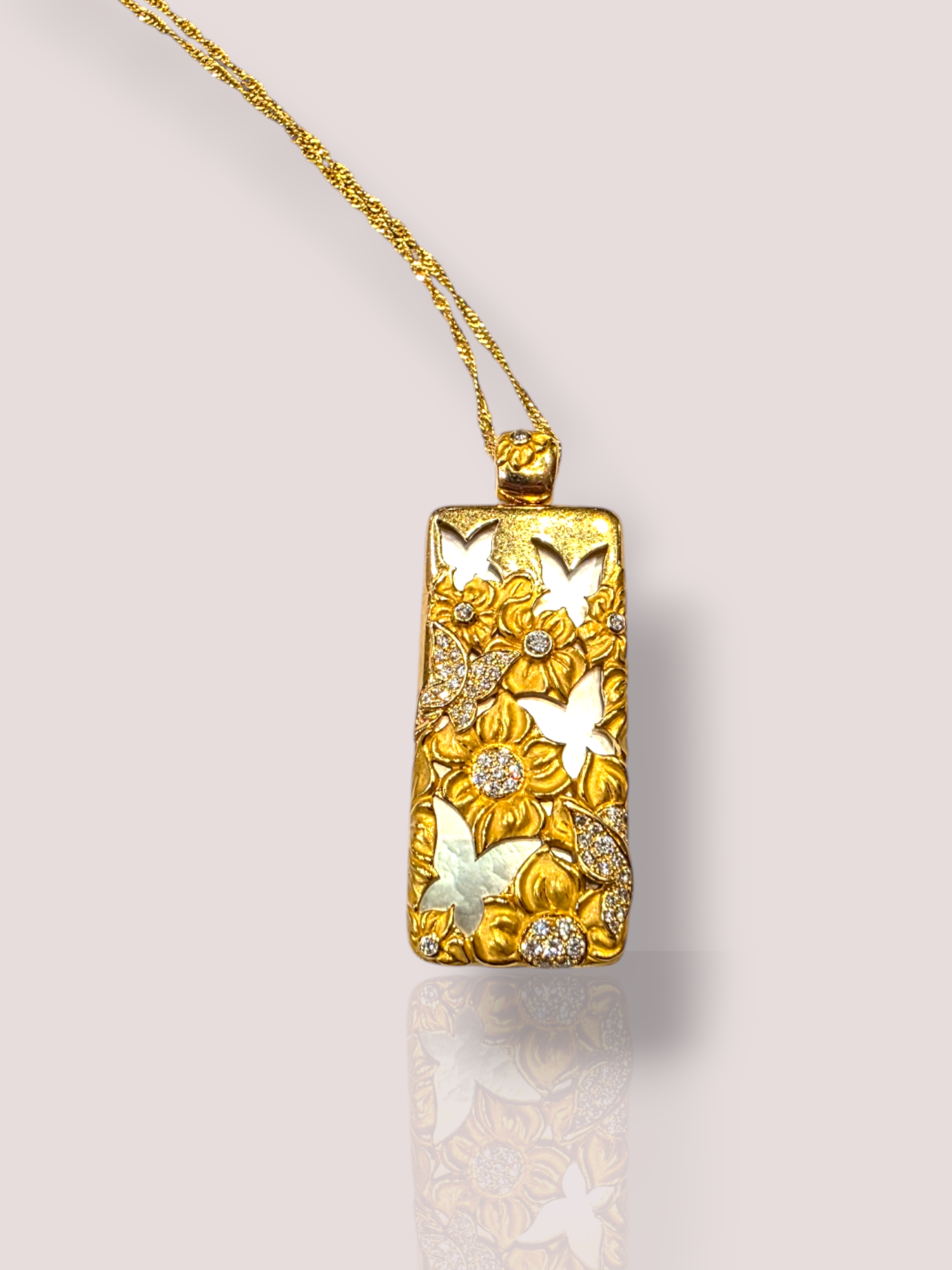 Dit prachtige Vintage 18k geelgouden collier combineert elegantie met verfijning. Het collier heeft een gouden hanger met daarin parelmoer gelegd. Op de hanger zijn in goud bloemen en vlinders gemaakt met sprankelende diamanten, wat het collier tot een heel bijzonder juweel maakt.