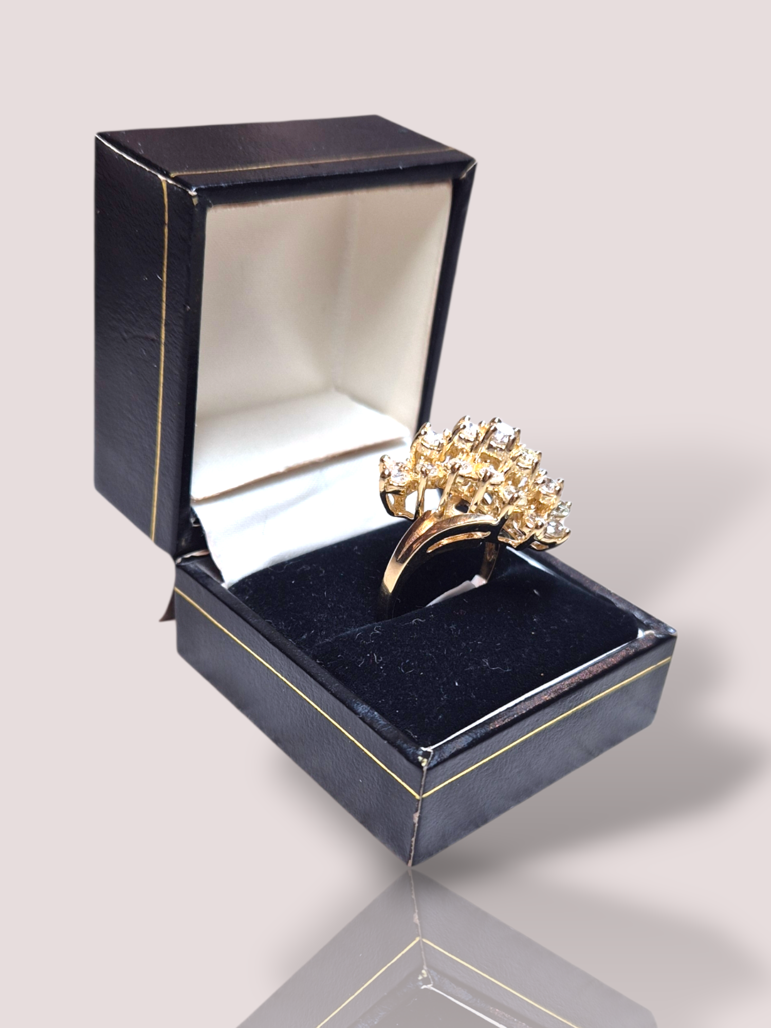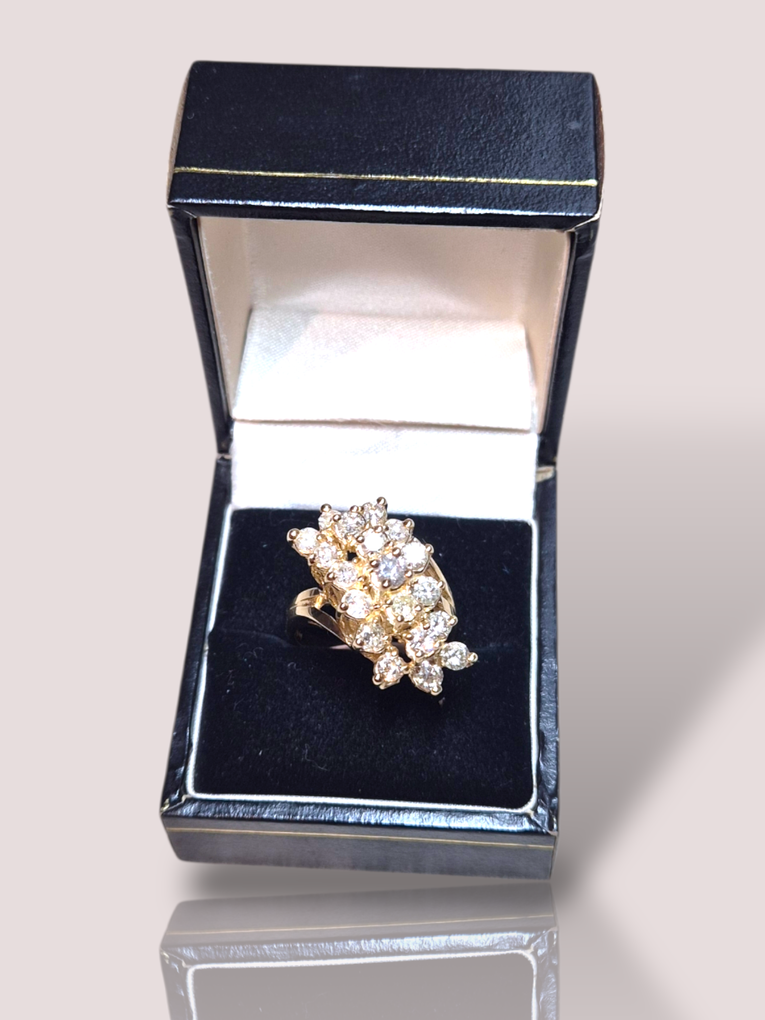 Deze Vintage 18k geel gouden diamanten statement ring straalt elegantie uit met zijn verfijnde ontwerp en schitterende diamanten. De ring bevat maar liefst 19 diamanten van in totaal circa 1,98ct. De diamanten variëren in kleur van I tot M.