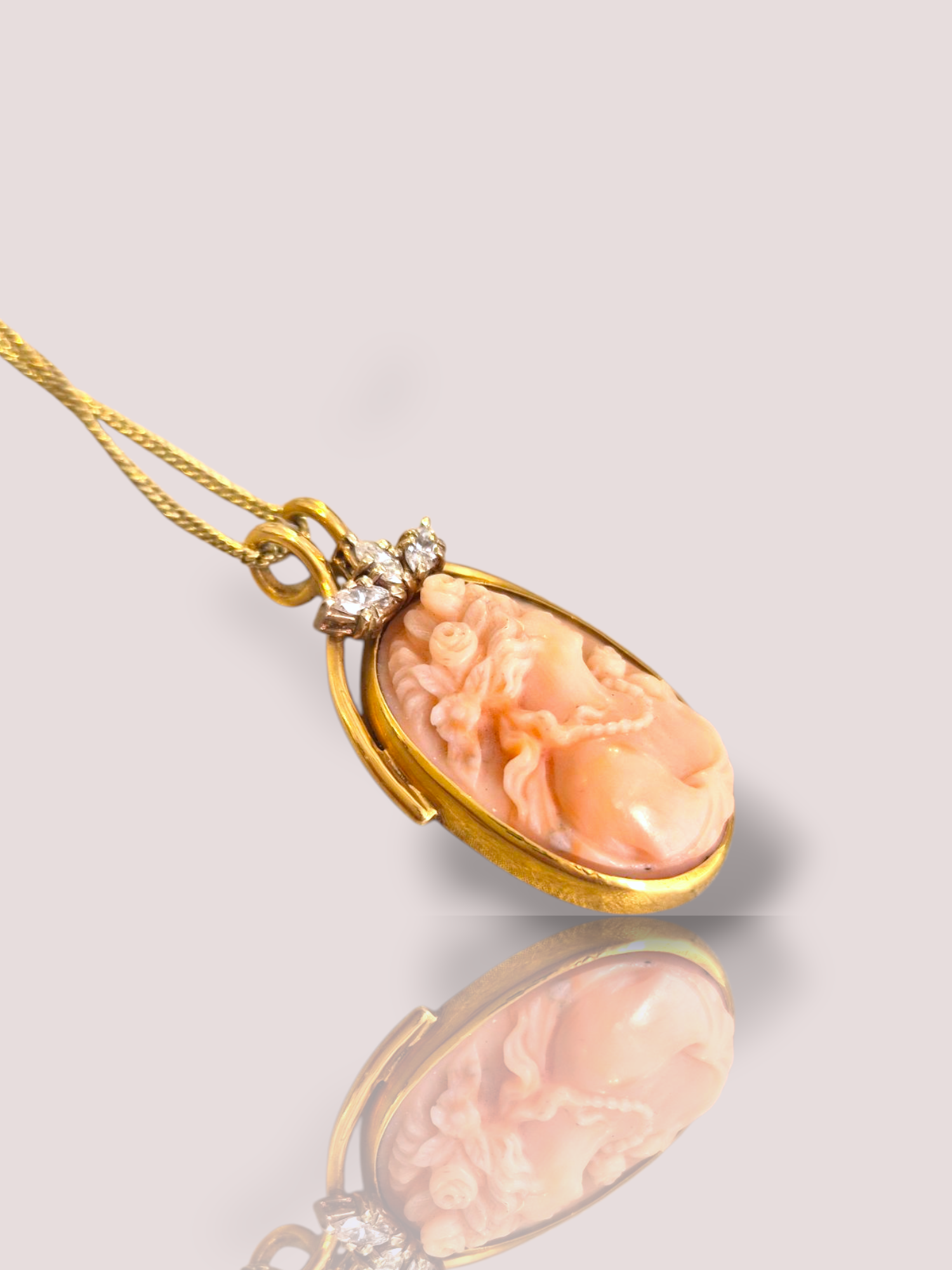 Deze Vintage 18k geelgouden hanger is voorzien van een prachtige angelskin camee en markies geslepen diamanten. Als onderdeel van de categorie hangers voegt het een verfijnde touch toe aan elke sieradencollectie. Draag deze hanger aan een lange ketting voor een elegante en tijdloze uitstraling. Perfect voor speciale gelegenheden of als een uniek cadeau.