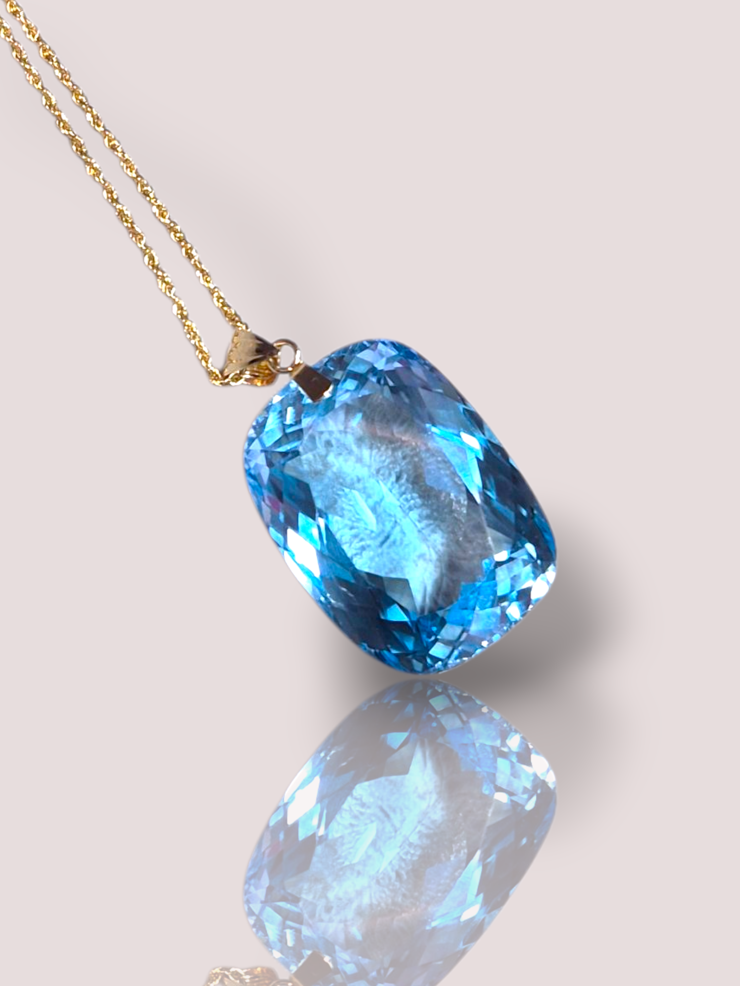 Deze Vintage 18k geel gouden hanger met Swiss Blue Topaas, is een elegant juweel. Met zijn betoverende blauwe steen straalt deze hanger luxe uit. Deze tijdloze hanger is perfect te dragen aan een fijne gouden ketting voor zowel dagelijkse elegantie als speciale gelegenheden. Voeg een vleugje verfijning toe aan elke outfit met deze prachtige hanger.