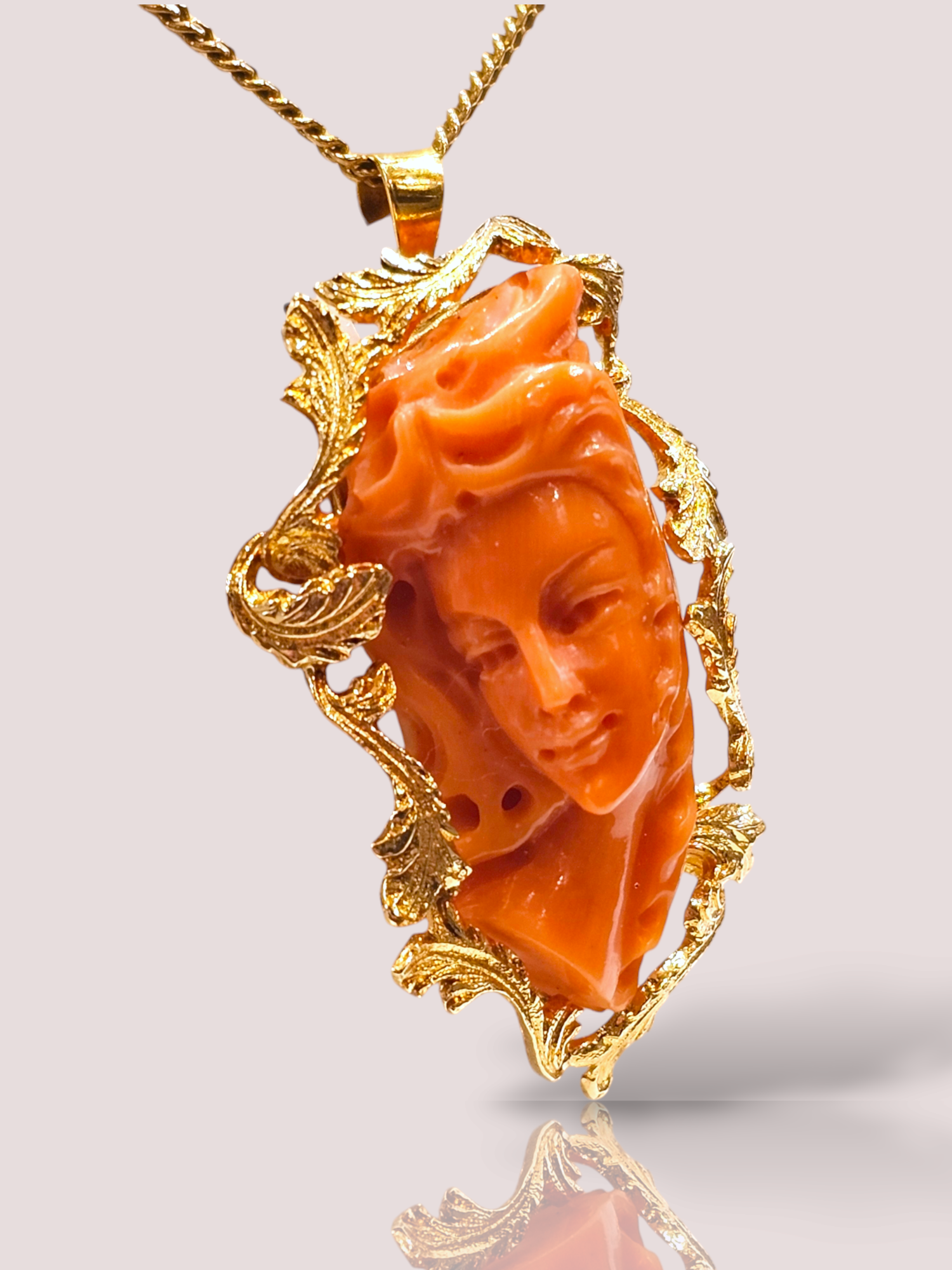 Deze vintage 18k geel gouden hanger is versierd met een prachtig beeld van een vrouw in bloedkoraal. De hanger straalt elegantie en schoonheid uit en voegt een vleugje luxe toe aan elke outfit. Draag deze hanger als statement piece aan een gouden ketting voor een verfijnde uitstraling. Een tijdloos en uniek stuk voor elke liefhebber van vintage sieraden. De hanger is 4 cm hoog en 2,5 cm breed. De kleur van het bloedkoraal kan in werkelijkheid afwijken van de foto.
