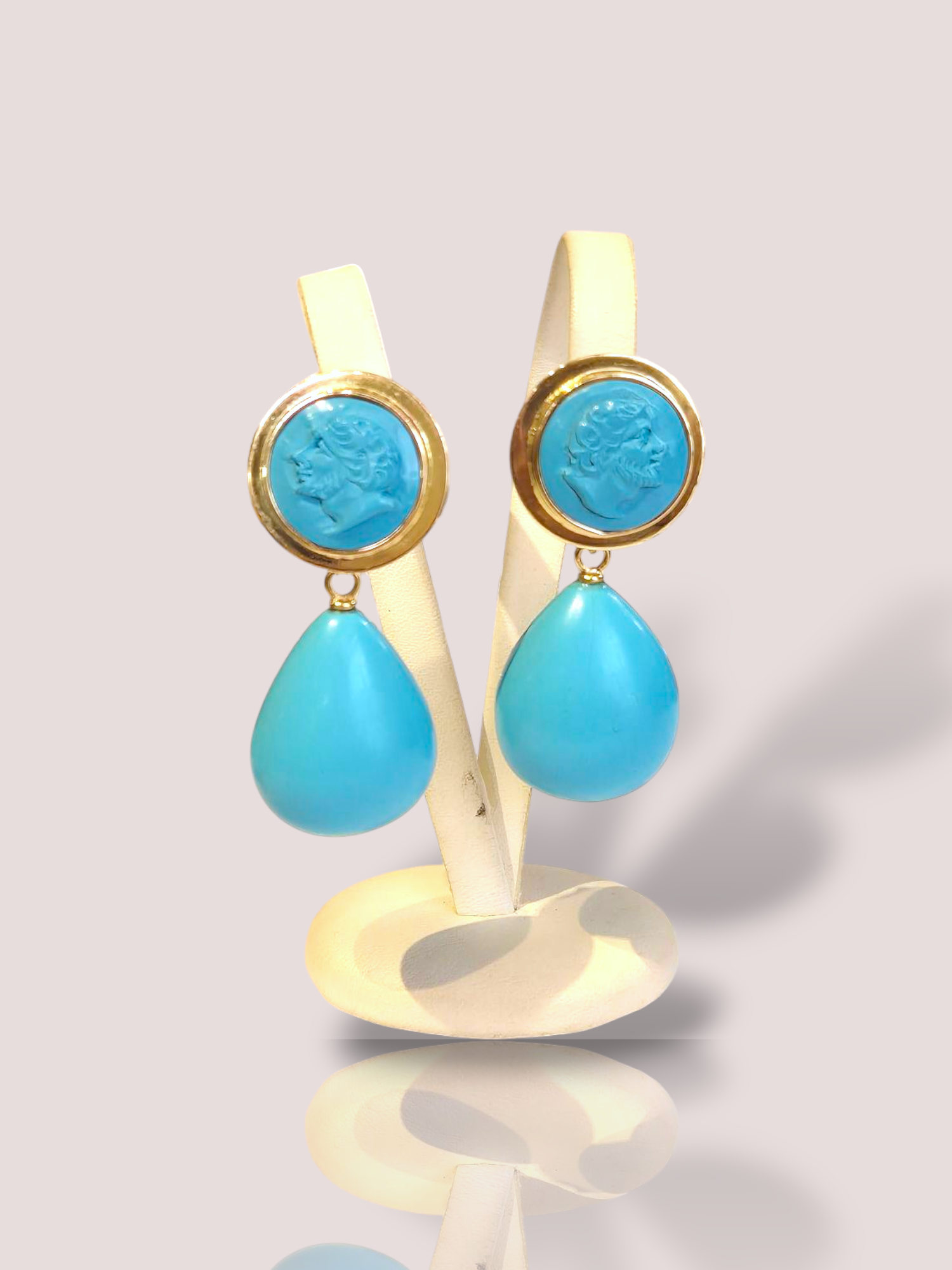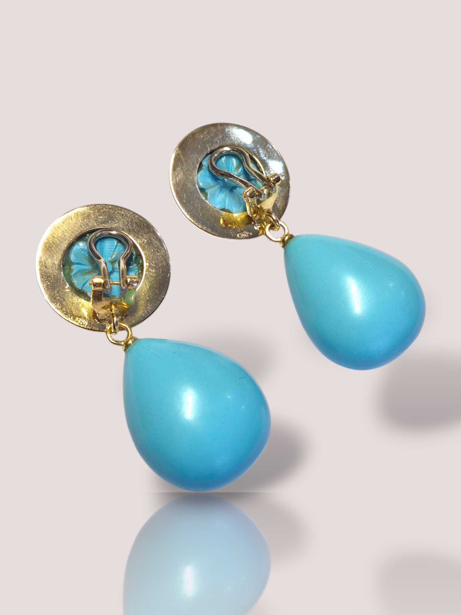Deze vintage 18k geel gouden oorclips met geperst turkoois, zijn luxe juwelen die elegantie uitstralen. Draag deze tijdloze oorclips voor een chique uitstraling bij zowel formele als casual gelegenheden. Perfect te combineren met opgestoken haar voor een stijlvolle look. De oorclips zijn 4,7 cm lang en kunnen desgewenst vermaakt worden tot oorstekers.