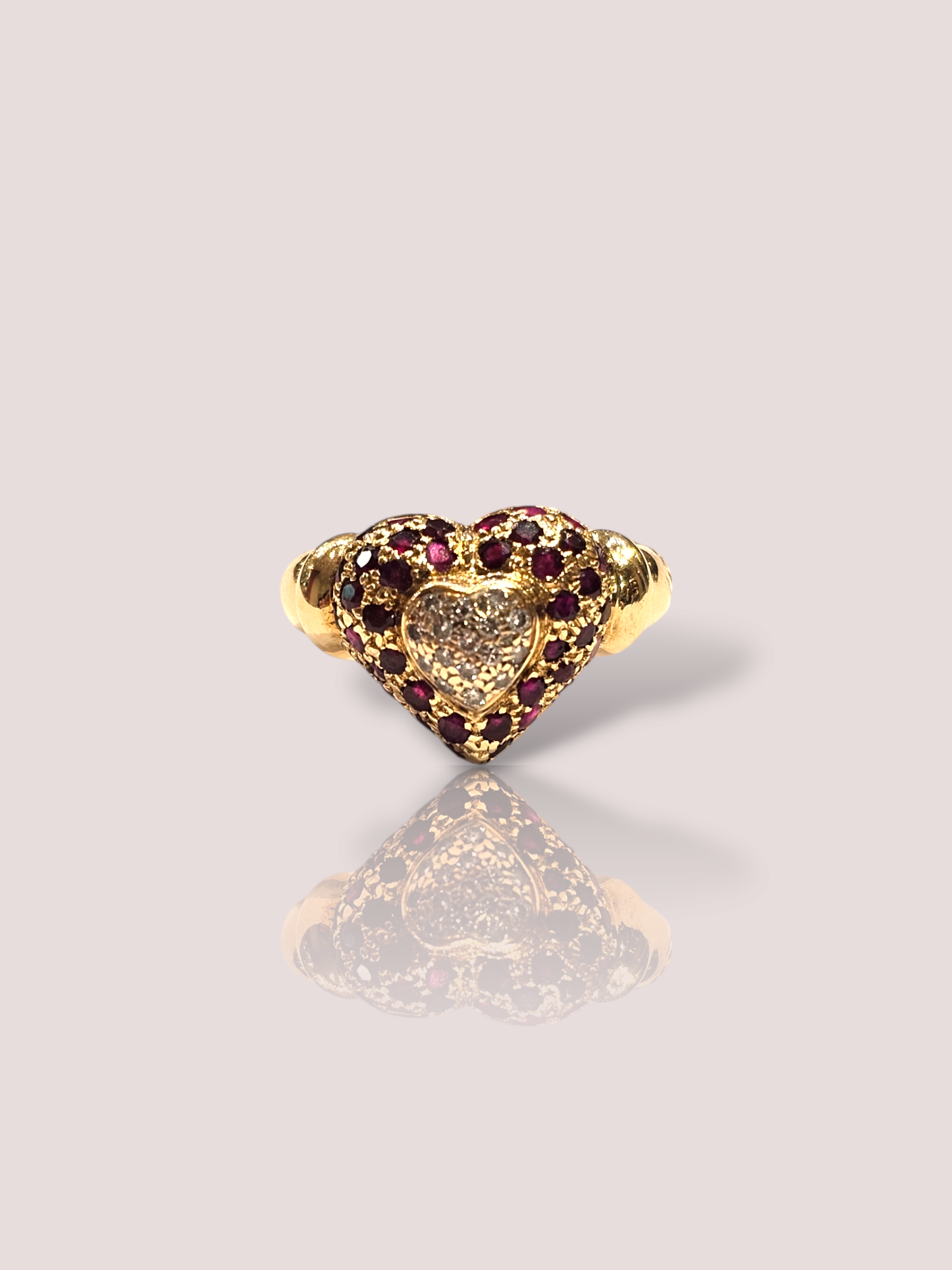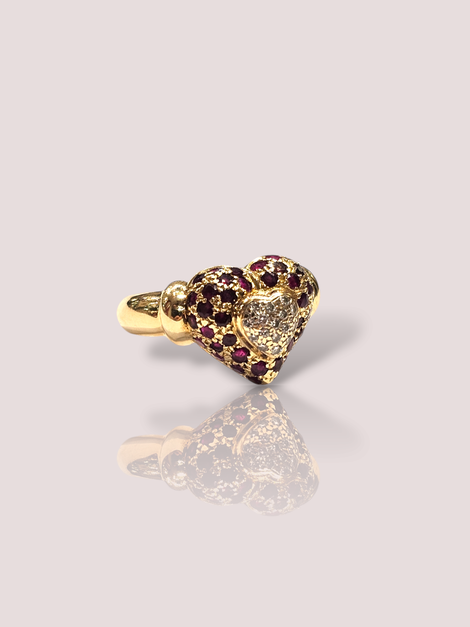 Deze prachtige vintage 18k geelgouden ring met robijnen en diamanten is een echt juweel om te koesteren. De ring is voorzien van schitterende robijntjes, met in het midden sprankelende diamanten, waardoor het een tijdloos stuk is voor elke gelegenheid. Draag deze ring alleen als statement piece of combineer hem met andere gouden sieraden voor een elegante look. Wat je stijl ook is, deze ring voegt een vleugje glamour toe aan je outfit.