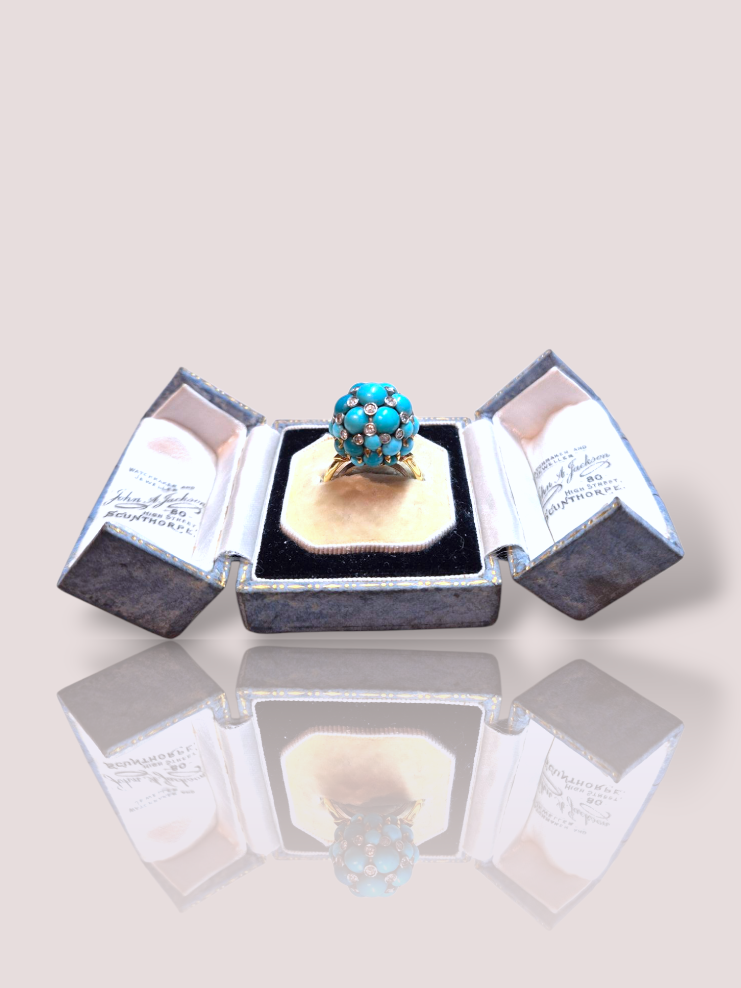 Deze vintage 18k geelgouden ring met turkoois en diamant is een verfijnd sieraad dat jouw uitstraling een elegante touch geeft. Deze ring, met zijn levendige turkoois en sprankelende diamanten, maakt elke outfit compleet. Draag hem solo voor een statement effect of combineer met andere ringen voor een trendy look. Perfect voor elke gelegenheid.