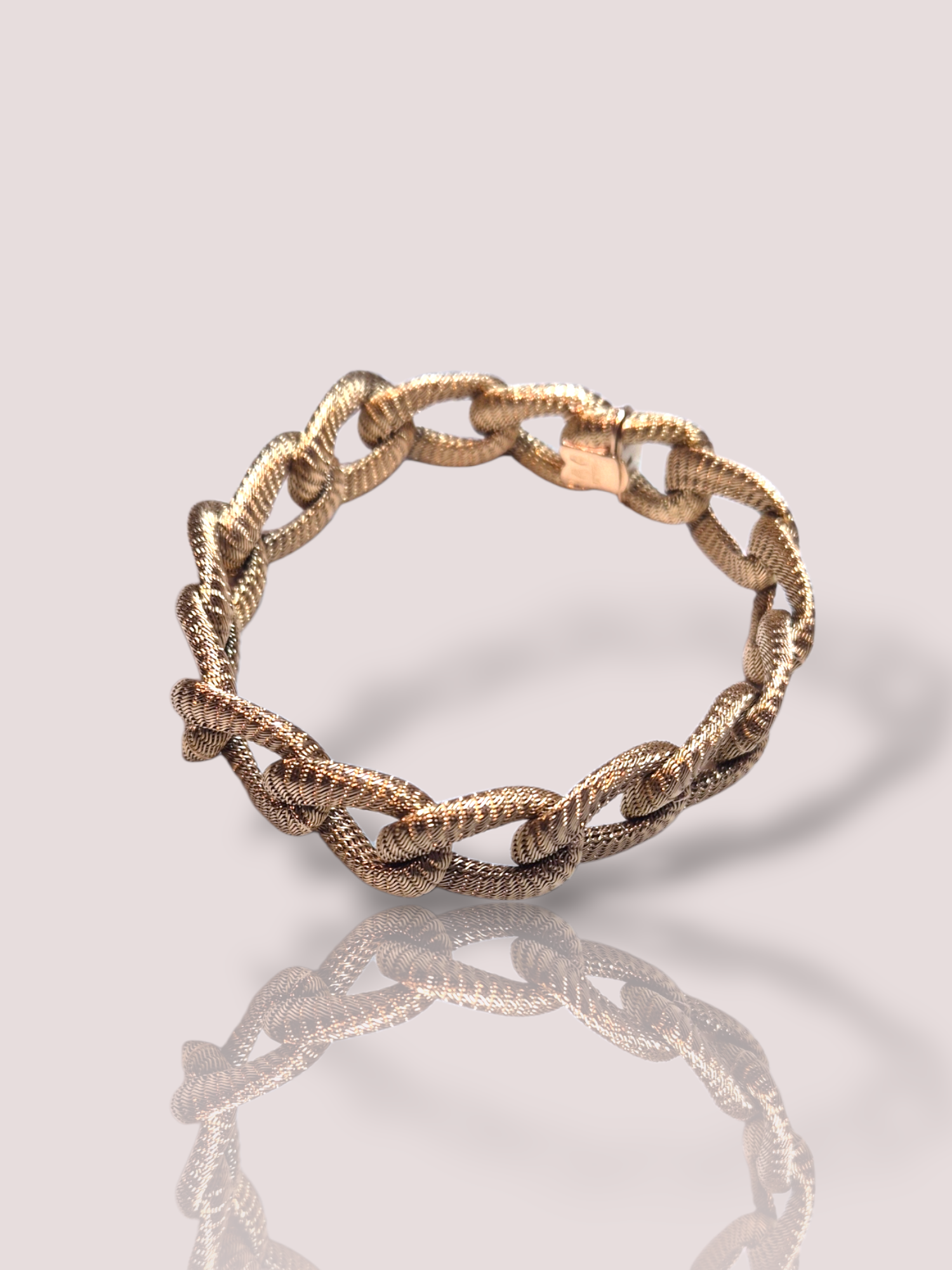 Deze Vintage 18k geel gouden schakel mesh armband is een verfijnd sieraad dat elegant het polsgewricht omarmt met zijn delicate mesh gevlochten ontwerp. Ideaal voor zowel dagelijkse als formele gelegenheden, voegt het een vleugje luxe toe aan elke outfit. Draag het solo voor subtiele elegantie of combineer met andere gouden sieraden voor een gelaagd effect.