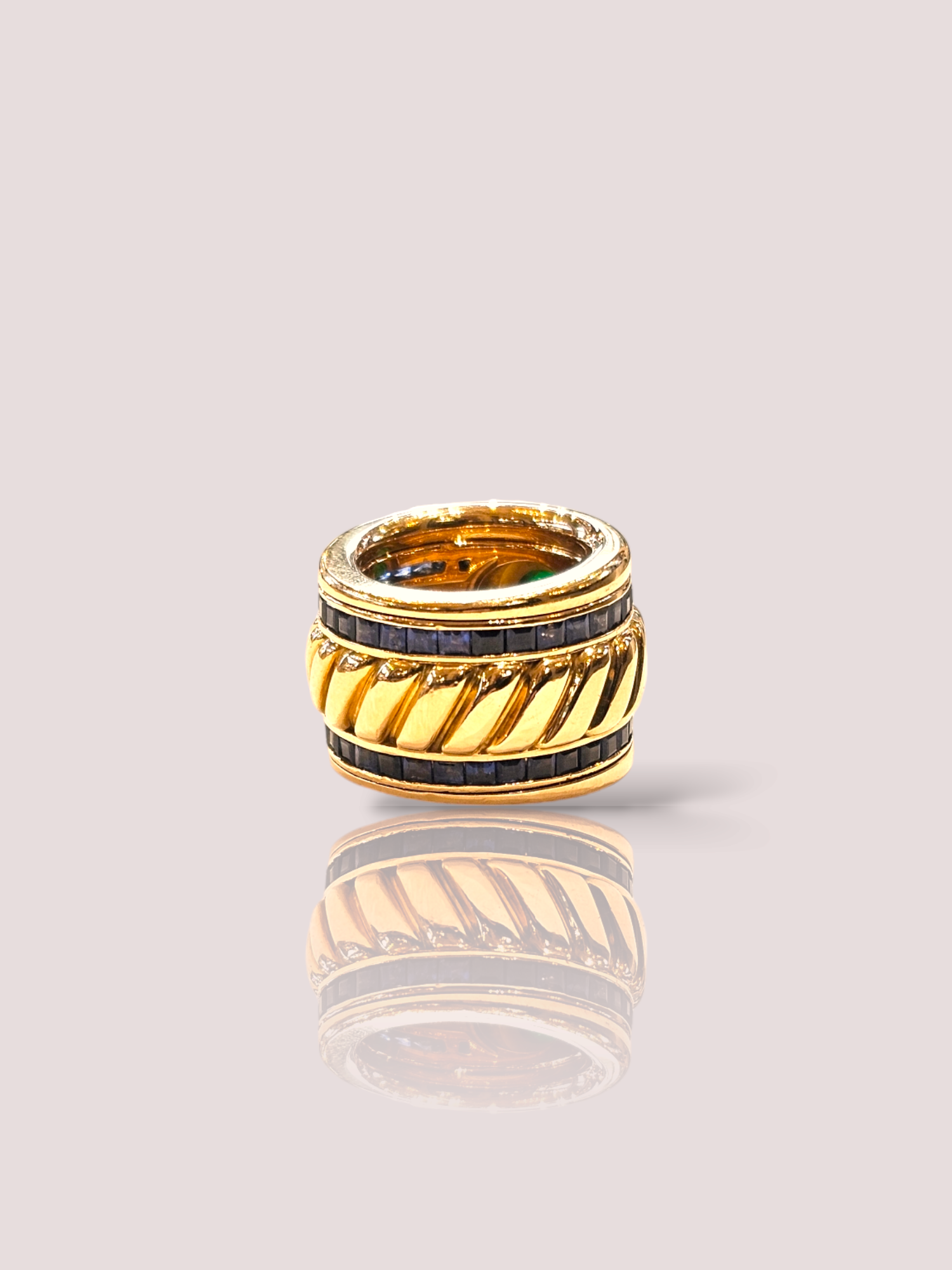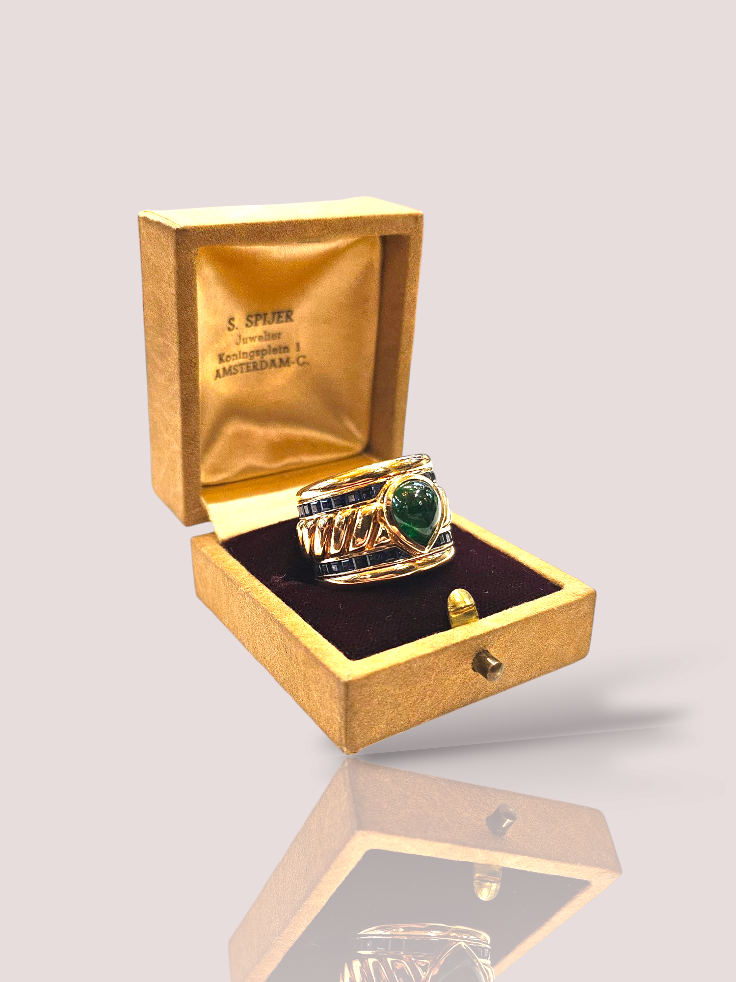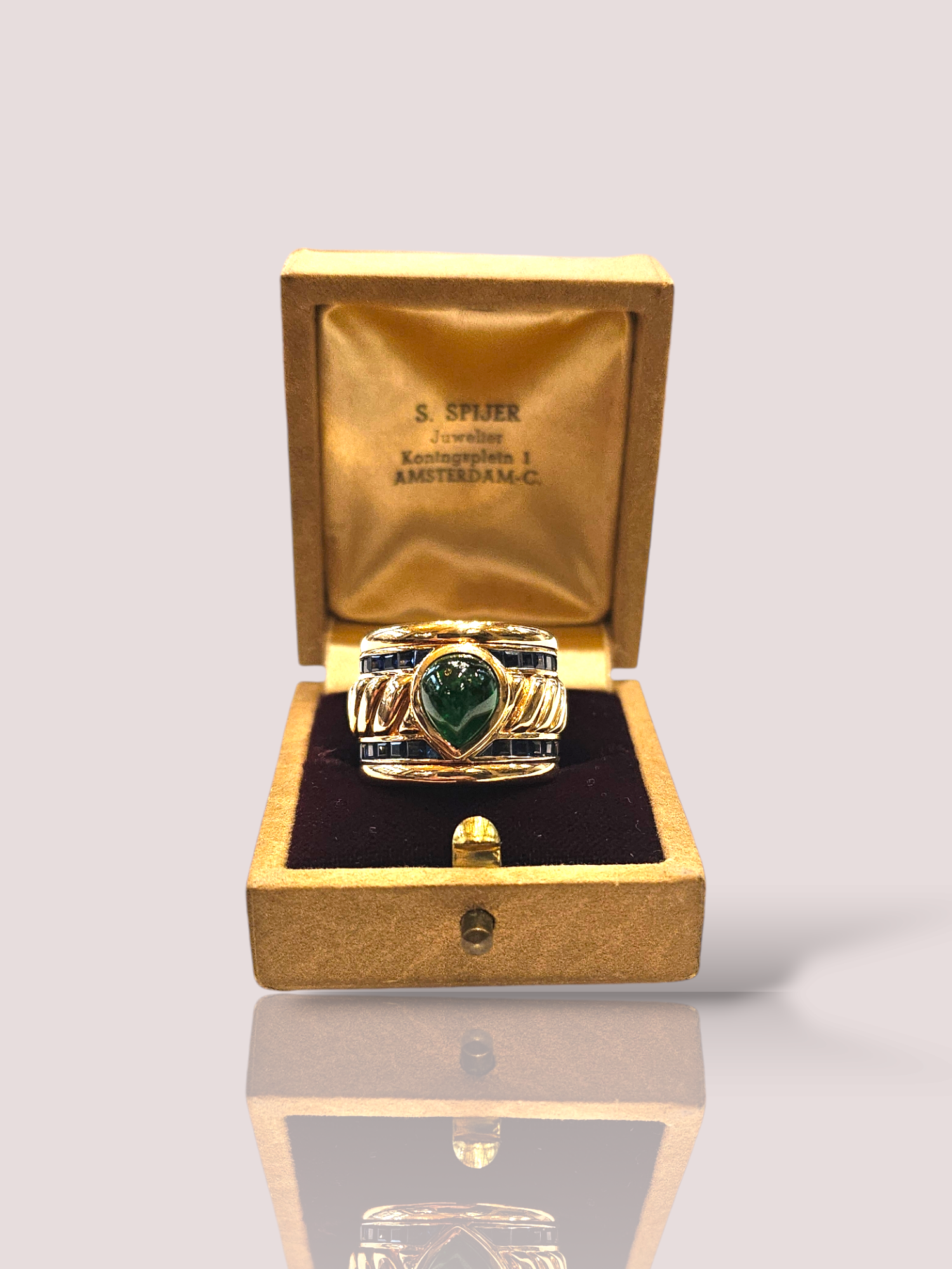 Deze vintage 18k geel gouden statement ring heeft prachtige saffieren en een cabochon geslepen smaragd, die schitteren in het licht. De ring is een echte eyecatcher en perfect voor speciale gelegenheden. Draag deze ring solo voor een subtiele touch of combineer hem met andere gouden sieraden voor een opvallende look. Voeg deze unieke ring toe aan je collectie voor een tijdloos en elegant stuk. De ring weegt 30,8 gram en heeft een fantastische afwerking. De ring is 1,7 cm hoog.