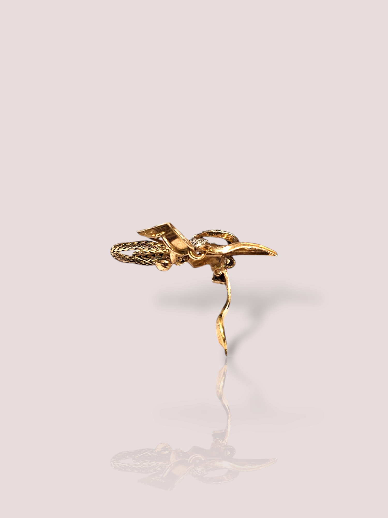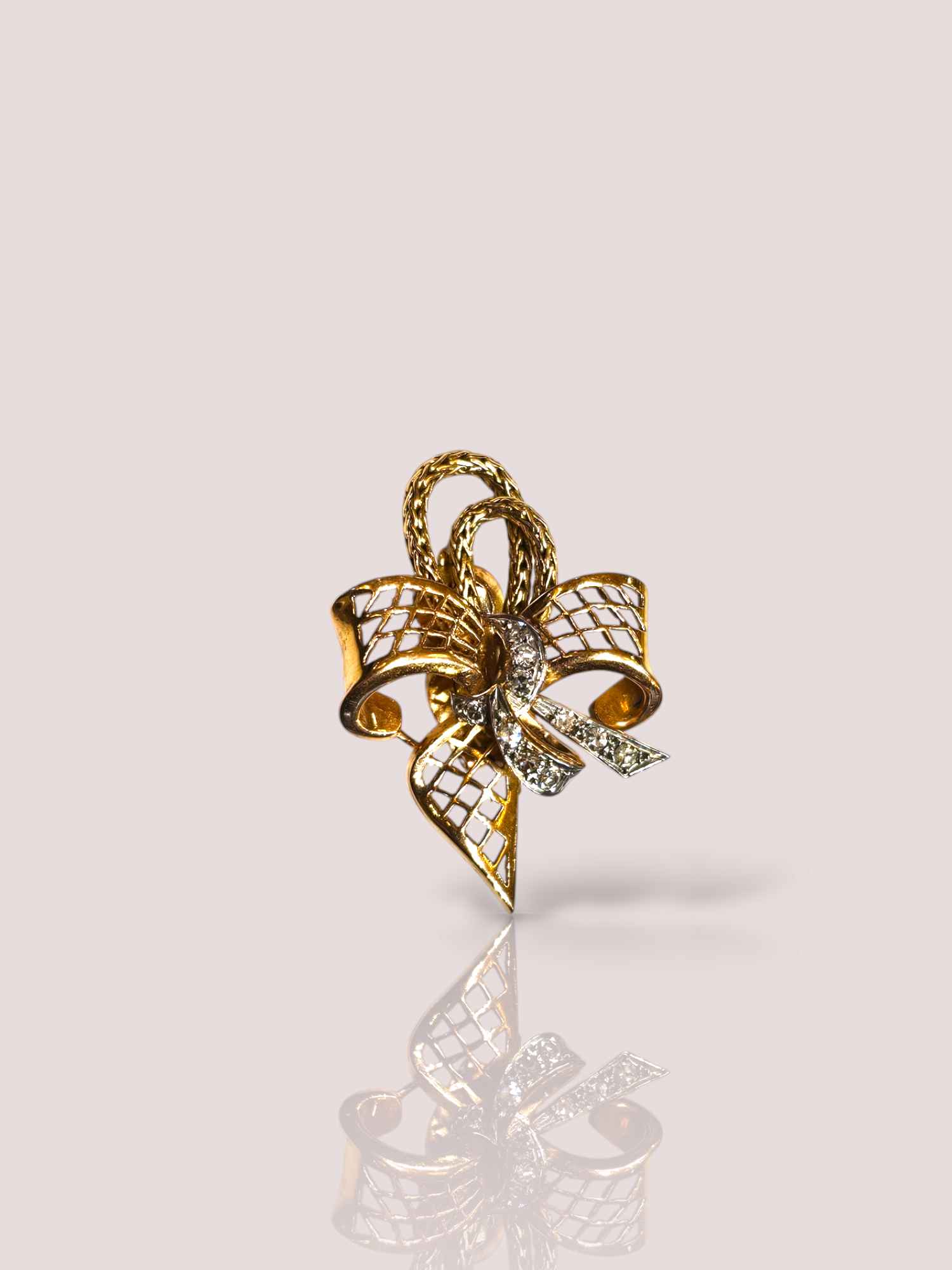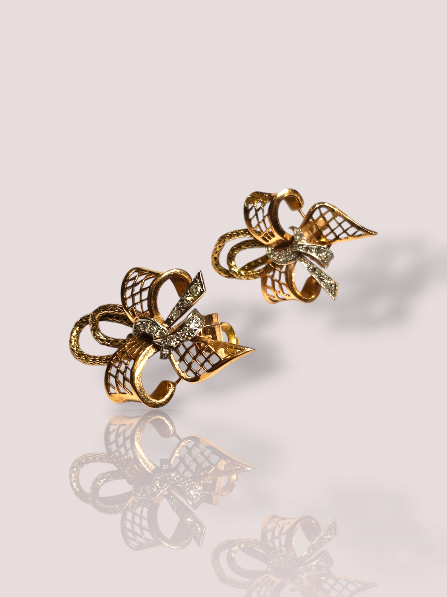Deze prachtige vintage oorclips zijn gemaakt van 18 karaat geel goud en zijn gedecoreerd met schitterende diamanten. De oorclips hebben de vorm van strikjes, wat zorgt voor een elegante en charmante uitstraling. Het beste is om deze oorbellen te dragen tijdens speciale gelegenheden, zoals gala's of feestjes, om je outfit een extra touch of glamour te geven. De oorclips zijn 3 bij 2,5 cm en kunnen vermaakt worden tot oorstekers.