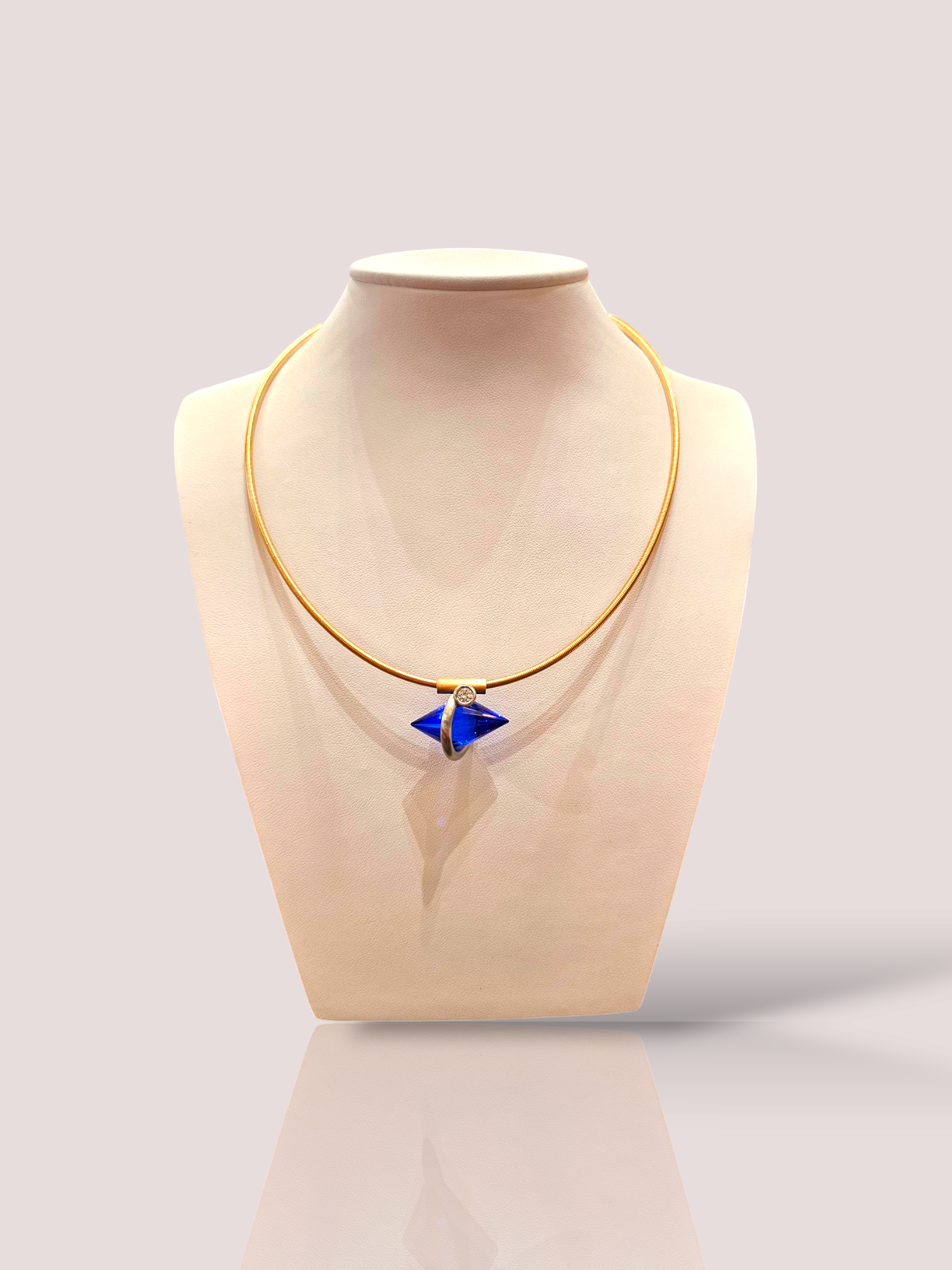 Dit prachtige vintage 18k roségouden collier van Bunz heeft een hanger van saffier en diamant, wat zorgt voor een tijdloze en elegante uitstraling. De collier kan op verschillende manieren gedragen worden, zowel bij casual outfits als bij formele gelegenheden. Combineer het met een eenvoudige blouse voor een chique look of draag het met een avondjurk voor een luxueuze uitstraling. Een veelzijdig sieraad dat elke outfit compleet maakt. De hanger is deels gemaakt van platina waarin de kegelvormige saffier wordt vastgehouden.