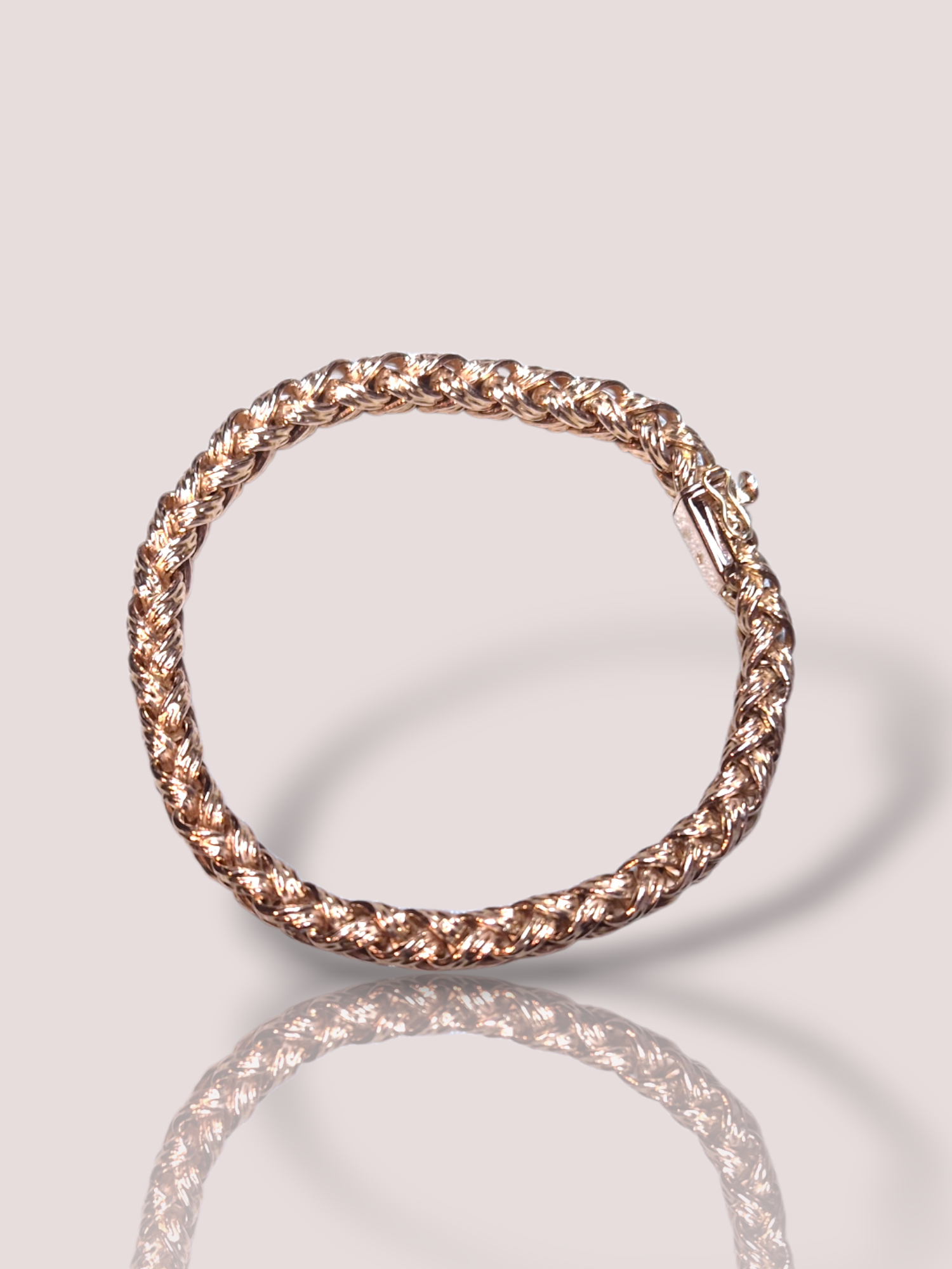 Deze Vintage 18k roségouden gevlochten jaren 70 armband, heeft een unieke, elegante uitstraling die perfect past bij elke gelegenheid. Deze tijdloze armband, een sieraad uit de categorie armbanden, is ideaal om solo te dragen als opvallend accessoire, of in combinatie met andere sieraden voor een gelaagde, chic look.