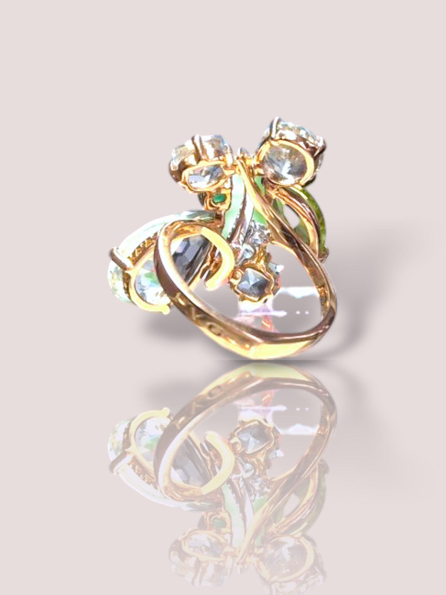 De ring bevat o.a. een smaragd, diamanten, aquamarijn, spinel en aquamarijn. Een geraffineerd ontwerp! De ring is 3 cm hoog.