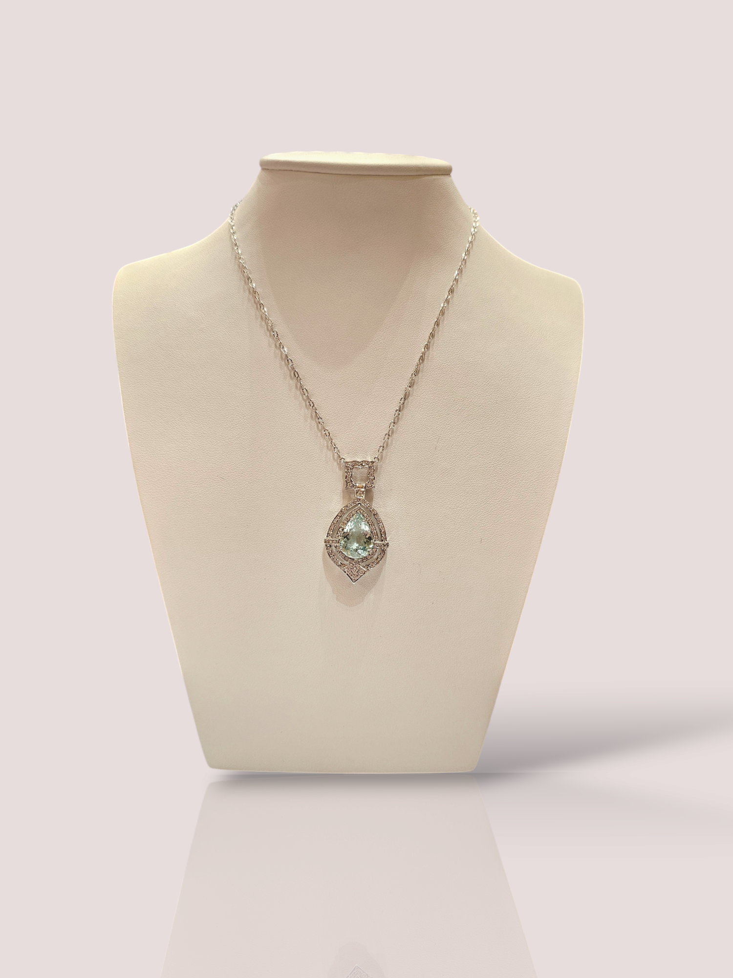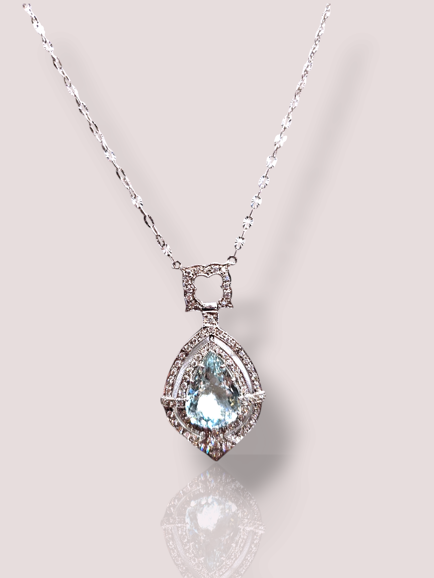 Deze prachtige vintage halsketting is gemaakt van 18 karaat witgoud en heeft een schitterende aquamarijn en diamanten hanger. De aquamarijn straalt een prachtige blauwe kleur uit en wordt omringd door fonkelende diamanten. Draag deze eyecatcher bij een chique avondjurk voor een elegante look of combineer het met een casual outfit voor een vleugje luxe. Deze halsketting is tijdloos en zal elke outfit naar een hoger niveau tillen. Het collier is 40 cm lang exclusief de prachtige hanger die vast zit aan het collier. De hanger heeft een hoogte van 4 cm en is 2 cm breed.