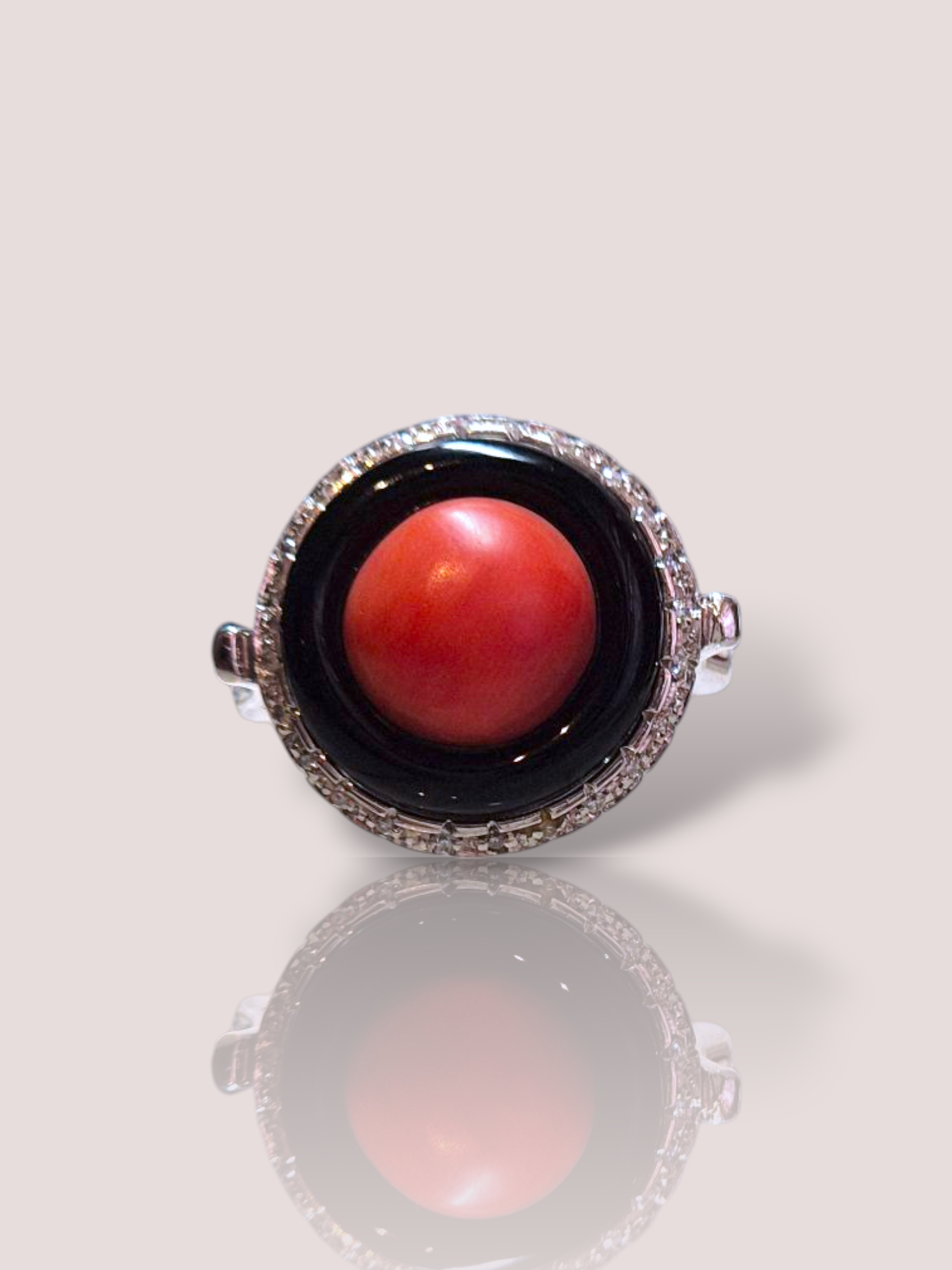 Deze Vintage 18k witgouden ring bevat koraal, onyx en diamanten. Perfect voor een luxe, elegante uitstraling. Draag hem solo voor een subtiele touch of combineer met andere ringen voor een gelaagde look. Ideaal voor speciale gelegenheden of als opvallend statement accessoire in je dagelijkse outfit. Een tijdloos juweel voor elke collectie.