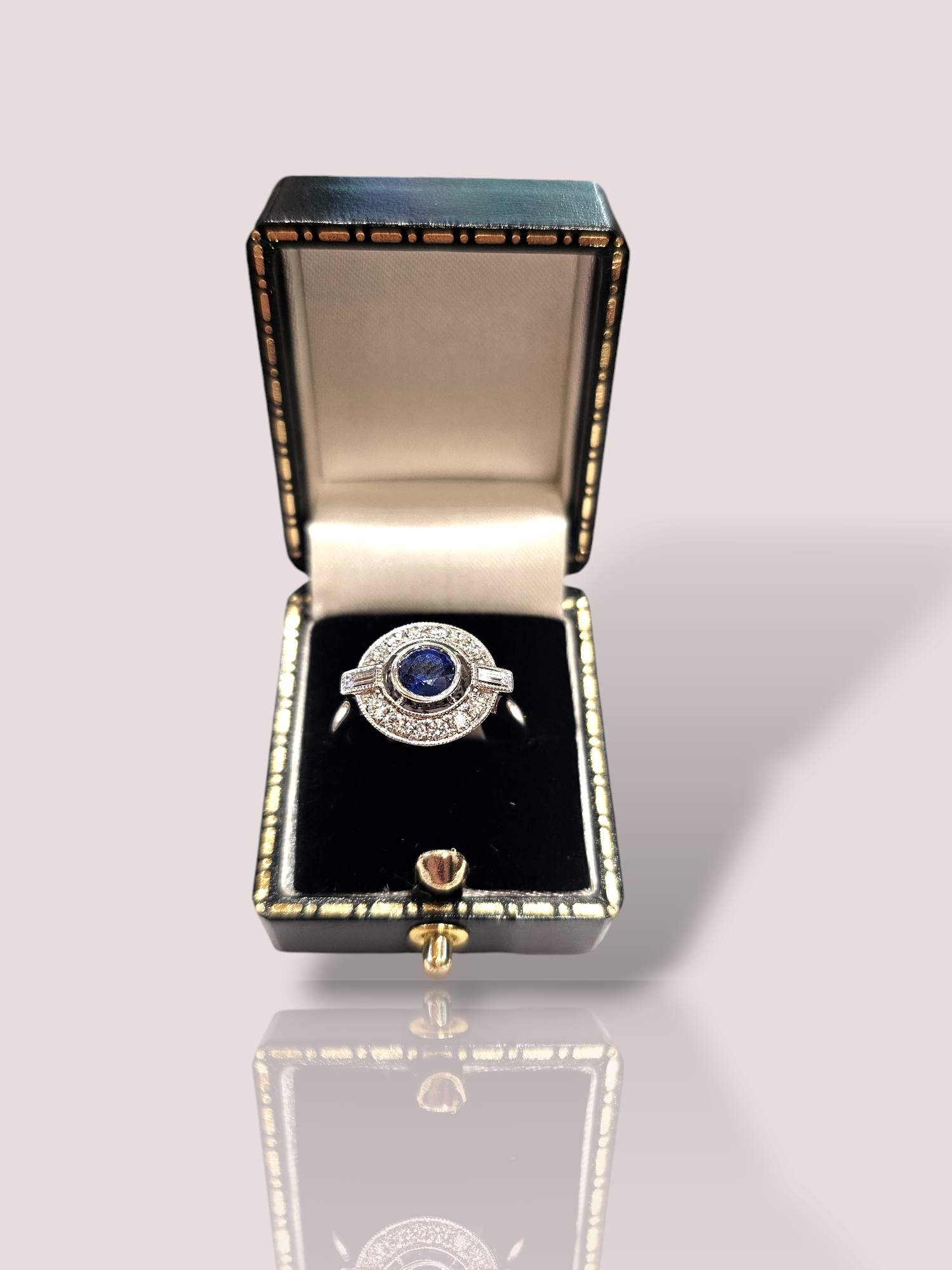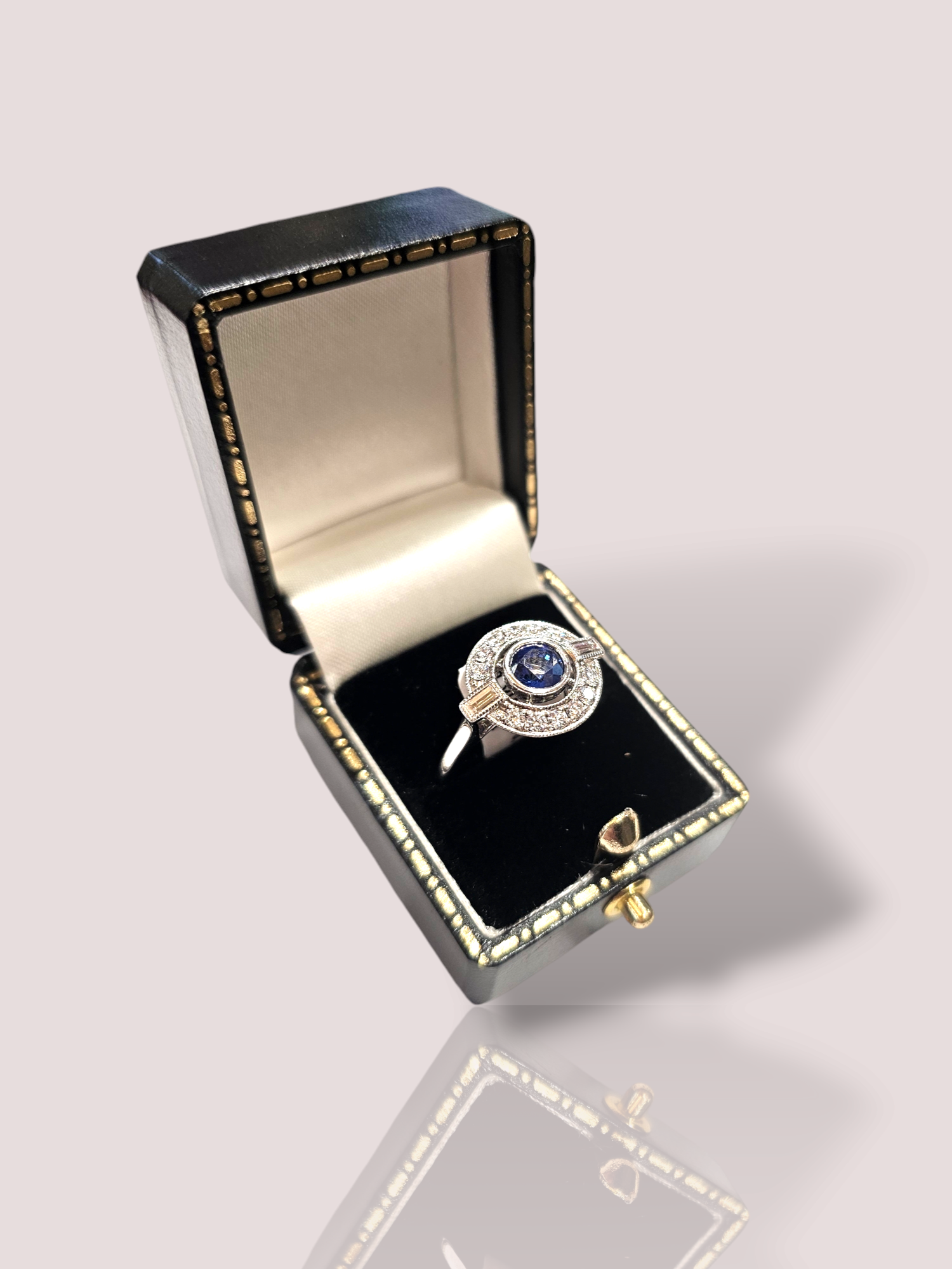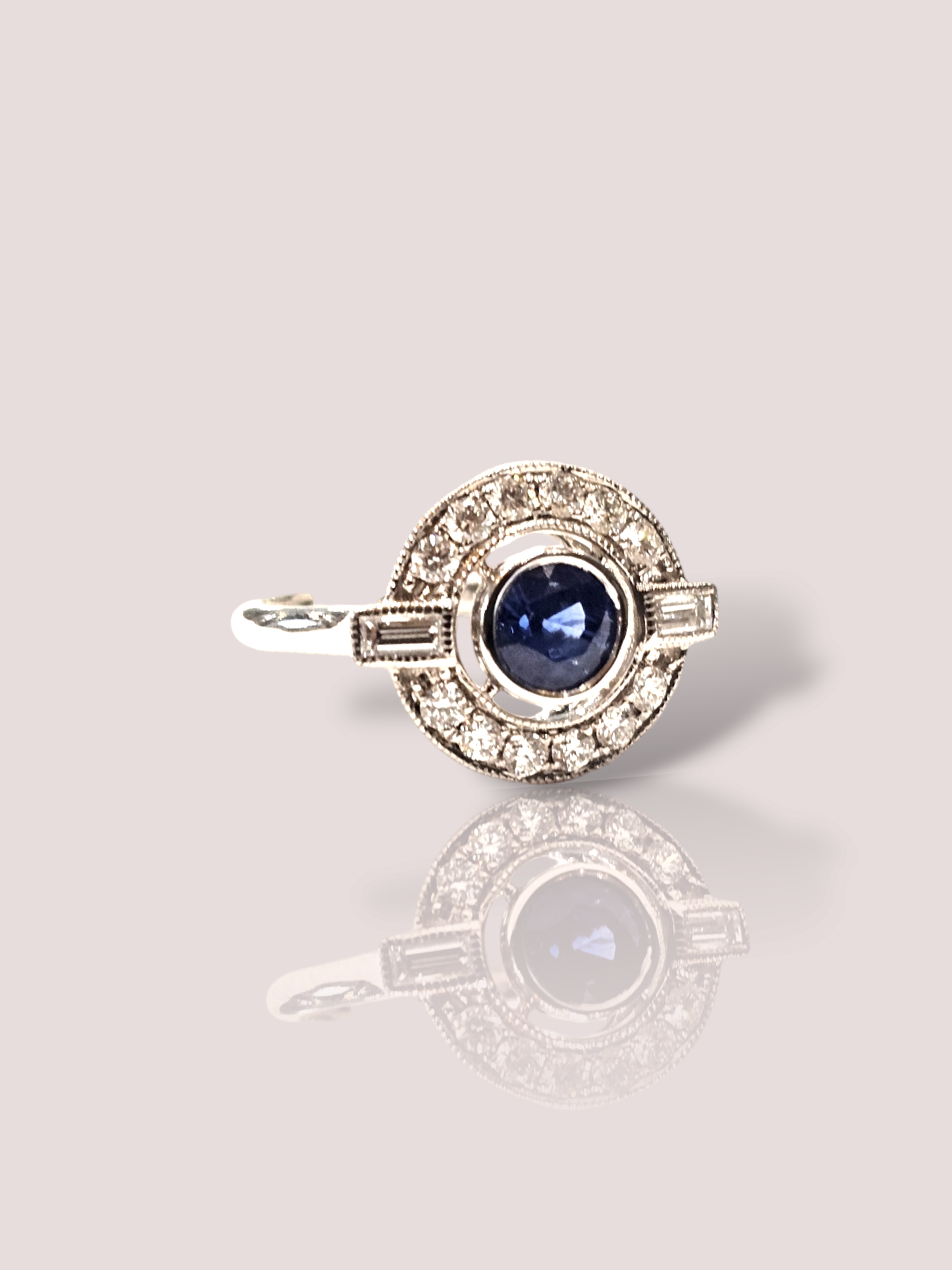 Deze prachtige vintage 18k witgouden ring is bezet met een schitterende saffier en diamanten. De ring straalt luxe en elegantie uit en is een tijdloos stuk dat perfect is voor speciale gelegenheden. Draag deze ring als een eye-catching statement piece bij een chique avondjurk of combineer hem met je dagelijkse kleding voor een vleugje glamour. De saffier heeft een diameter van 6 mm. De ring kan eventueel op maat gemaakt worden.