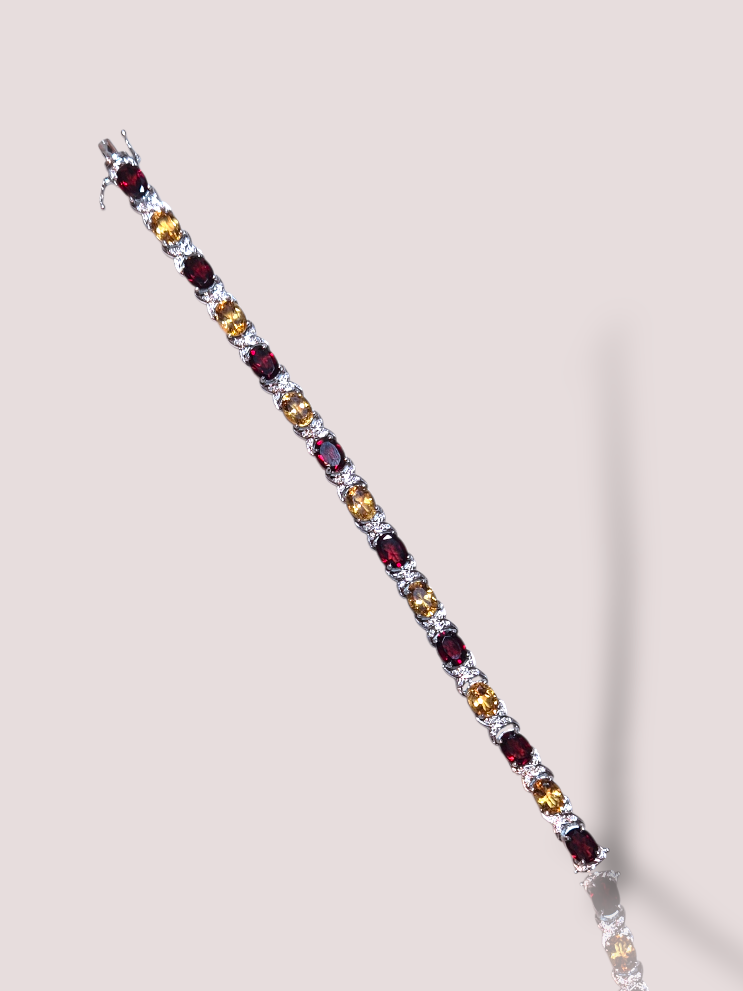 De armband bevat 7 citrienen en 8 granaten en de armband weegt 20,4 gram.
