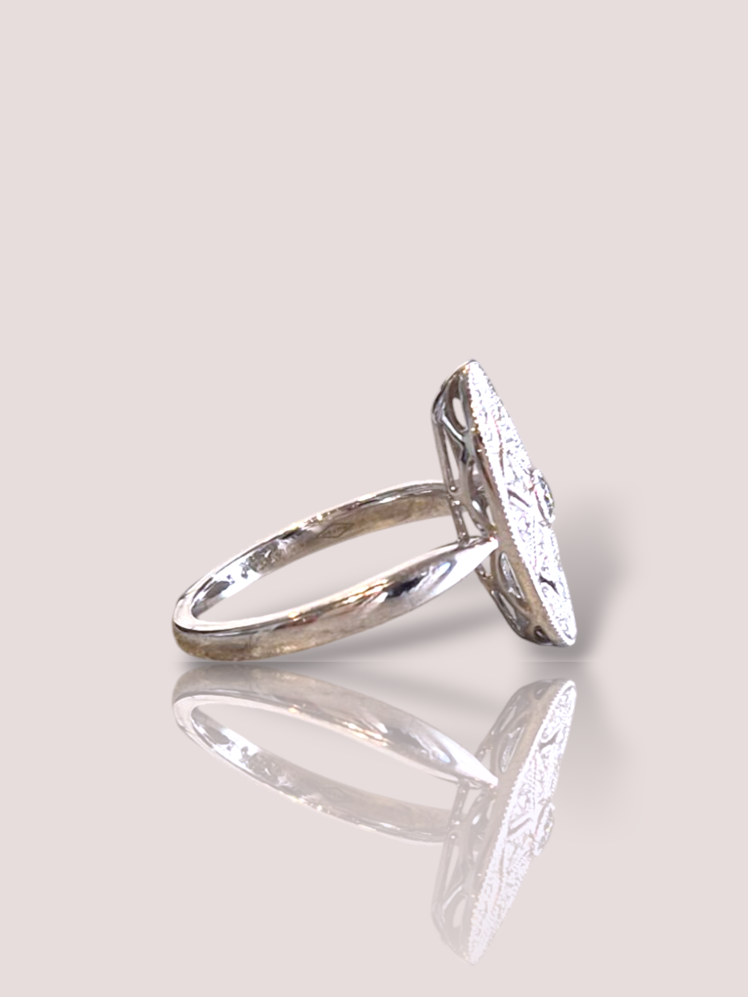 Deze prachtige vintage 18k witgouden ring is versierd met schitterende diamanten en heeft een tijdloos ontwerp dat perfect is voor elke gelegenheid. Het is een ware eyecatcher die elke outfit een luxe uitstraling geeft. Draag deze ring als een statement piece bij een avondje uit of combineer hem met andere ringen voor een meer subtiele look. Met deze ring voeg je gegarandeerd een vleugje glamour toe aan je outfit! De ring kan vermaakt worden en is 1,8cm hoog en 1 cm breed.
