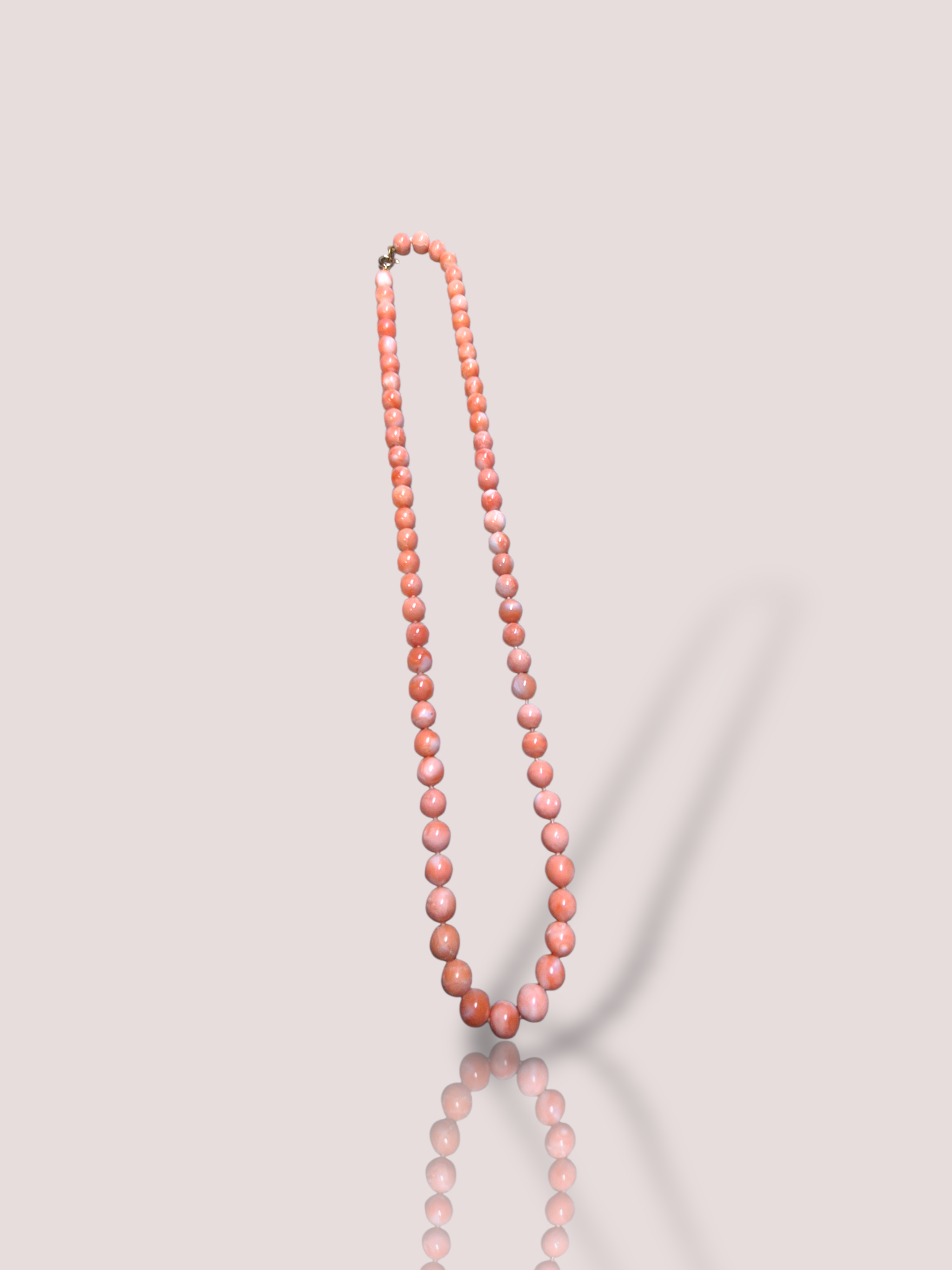 Deze Vintage angel skin bloedkoralen kralenketting, is een uniek en tijdloos sieraad. Met zijn warme doch frisse roze tinten en zachte textuur voegt de ketting een elegante touch toe aan elke outfit. Ideaal te dragen als statement stuk op een eenvoudige, klassieke top of jurk. Perfect voor zowel formele als informele gelegenheden.
