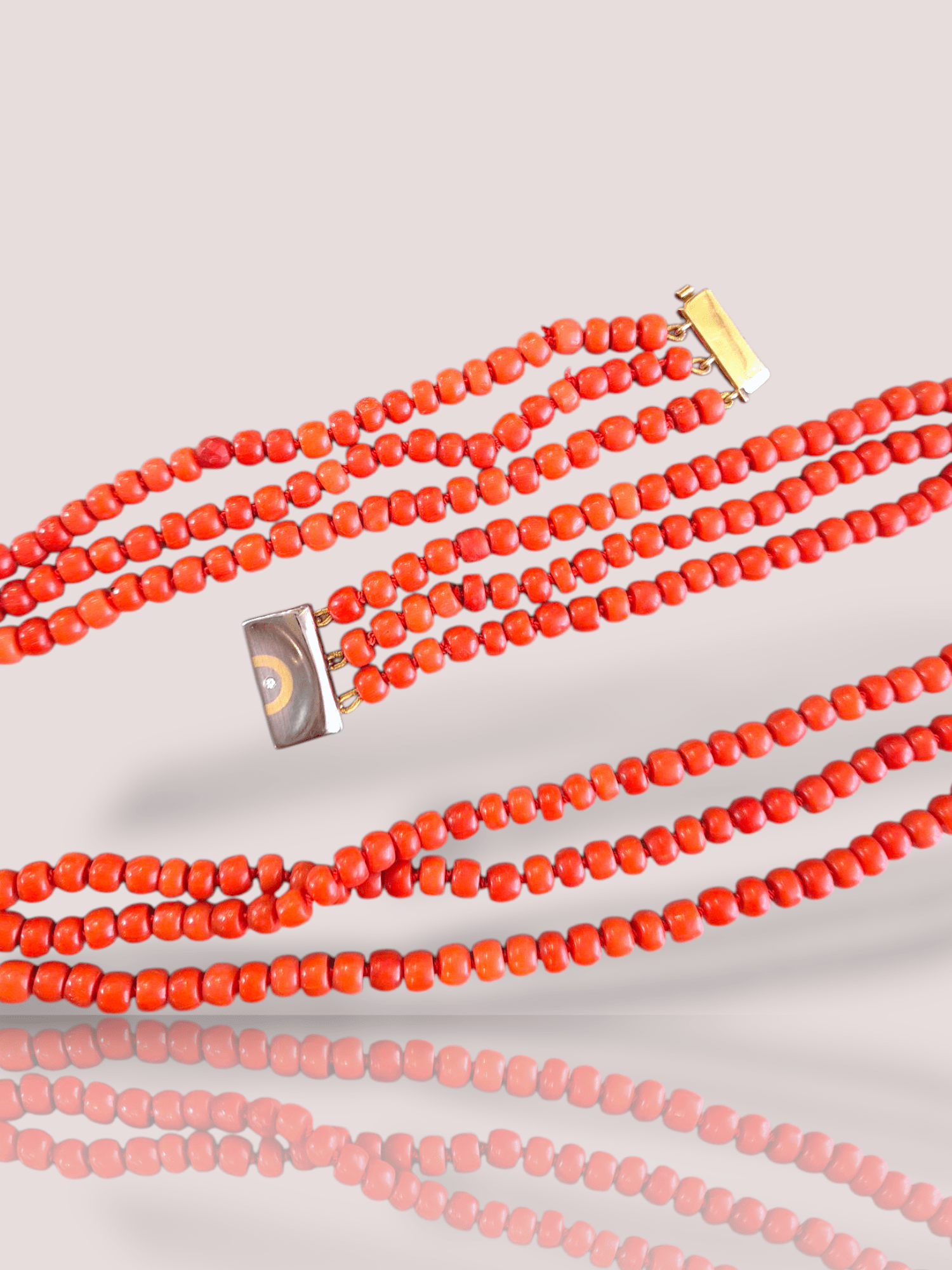 Dit prachtige vintage bloedkoralen collier heeft drie strengen en is voorzien van een elegant 18k gouden slot. De strengen bloedkoraal hebben een lengte van 48 cm, 52cm en 53 centimeter en weegt ruim 63 gram. Draag het als een opvallend statement bij een avondjurk of als elegant accessoire bij een stijlvolle blouse voor een verfijnde look.