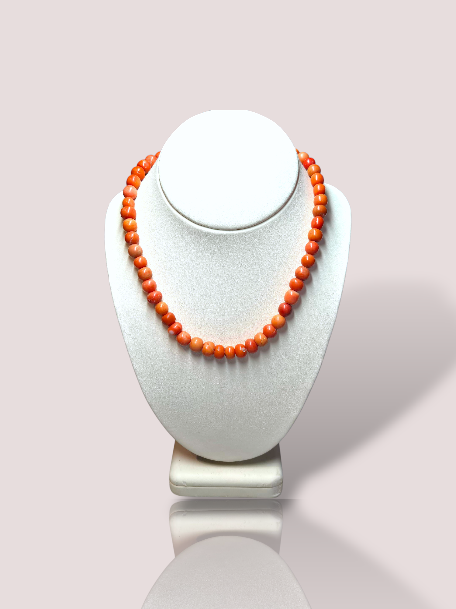 Dit vintage bloedkoralen 'angel skin' collier is een prachtig sieraad. Dit unieke collier verdient een centrale plek bij elegante outfits. Het collier heeft roze angel skin bloedkoralen, op de foto lijken de kralen meer oranje. De bloedkoralen hebben een dikte van 9 mm en het collier weegt 51,45 gram.