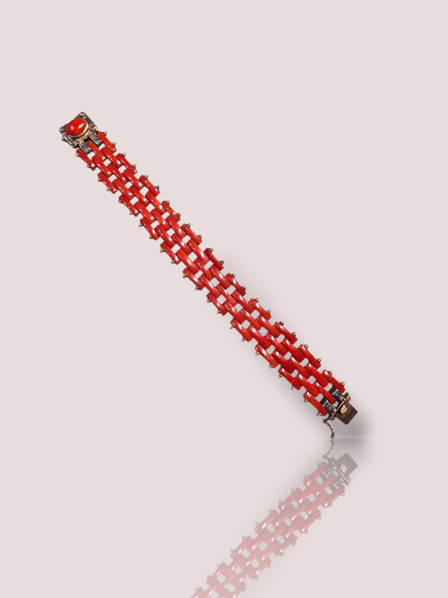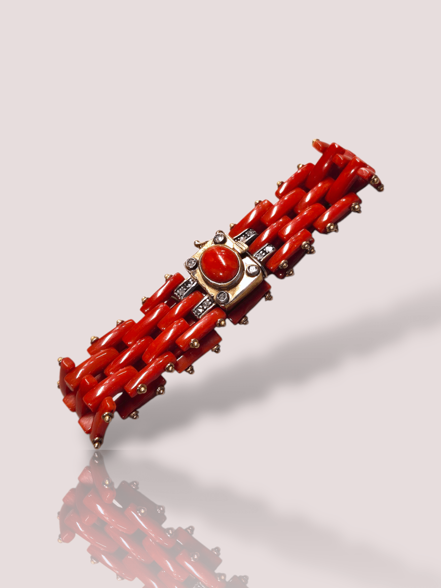 Deze vintage bloedkoralen gouden armband met diamant is een prachtig juweel van elegante allure. Deze armband combineert schitterende langwerpig gevormde bloedkoralen met verfijnde gouden details en diamanten. Draag hem als een statement stuk alleen, of combineer met andere sieraden voor een stijlvolle look. Perfect voor zowel dagelijkse gelegenheden als speciale evenementen.