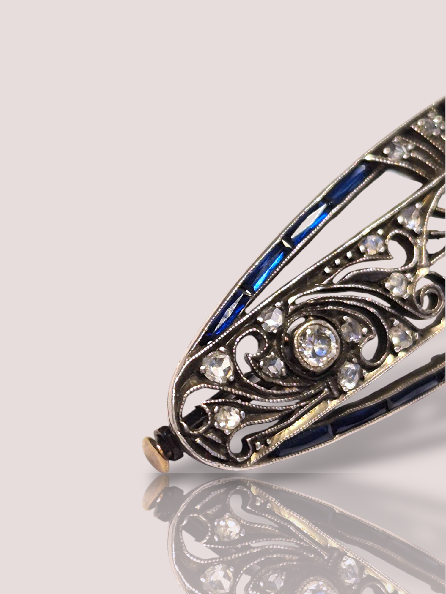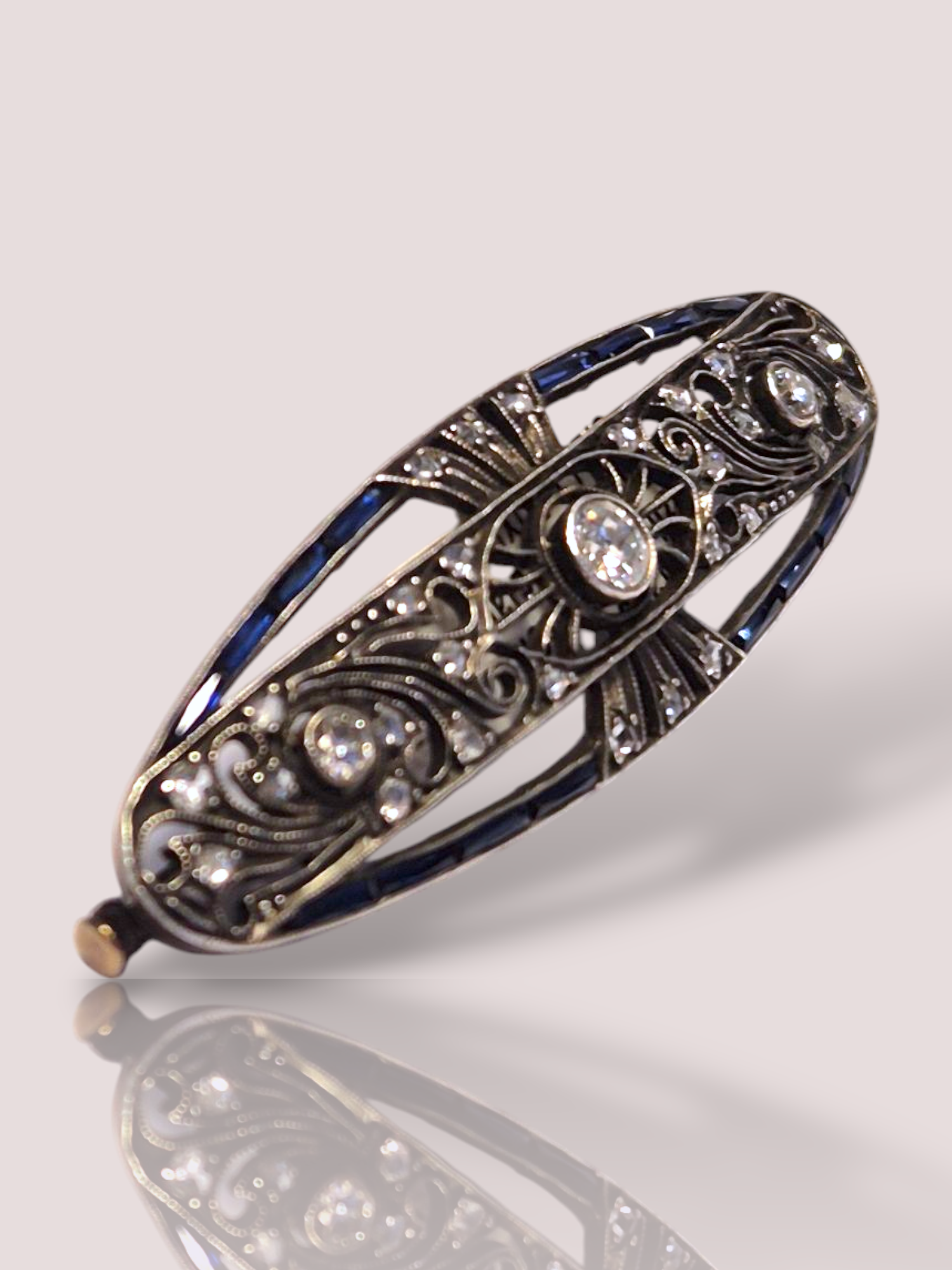 Deze vintage broche is voorzien van Bolsjewiek geslepen diamanten en saffieren, waardoor hij een oogverblindend en luxueus uiterlijk heeft. De diamanten en saffieren zijn gezet in zilver. De broche kan op verschillende manieren gedragen worden, zoals op een blouse, jasje of zelfs op een avondjurk voor een extra vleugje glamour. Voeg deze prachtige broche toe aan je collectie voor een vleugje vintage chic.