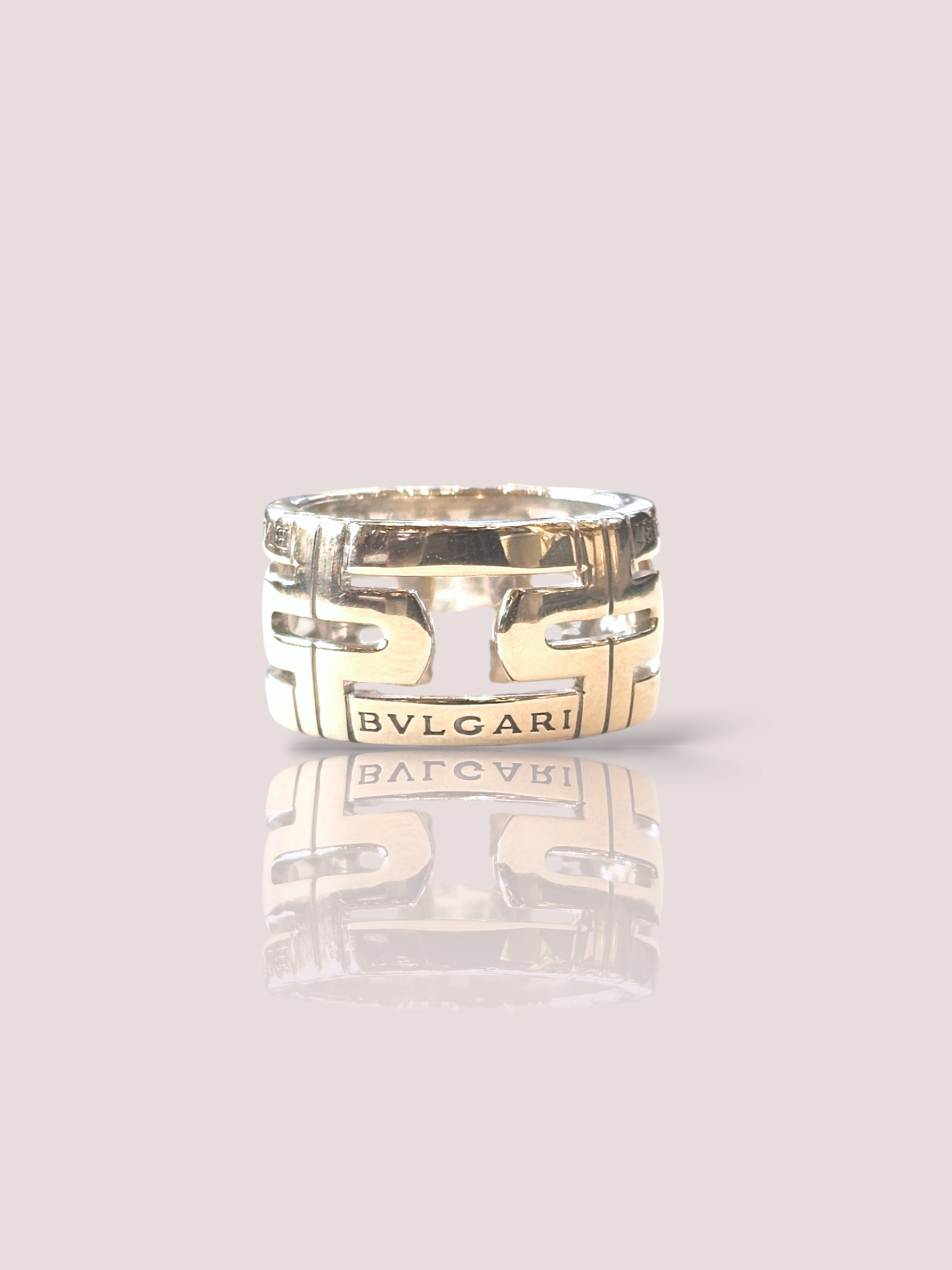 Deze Vintage Bulgari Parentesi 18k witgouden ring is voorzien van een opvallend en tijdloos design, perfect voor het toevoegen van een vleugje elegantie aan elke outfit. De ring is gemakkelijk te combineren met zowel casual als formele looks, waardoor het een veelzijdige accessoire is. Draag het solo voor een verfijnde touch of stapel het met andere ringen voor een trendy uitstraling. De ring is 1,1 cm hoog.