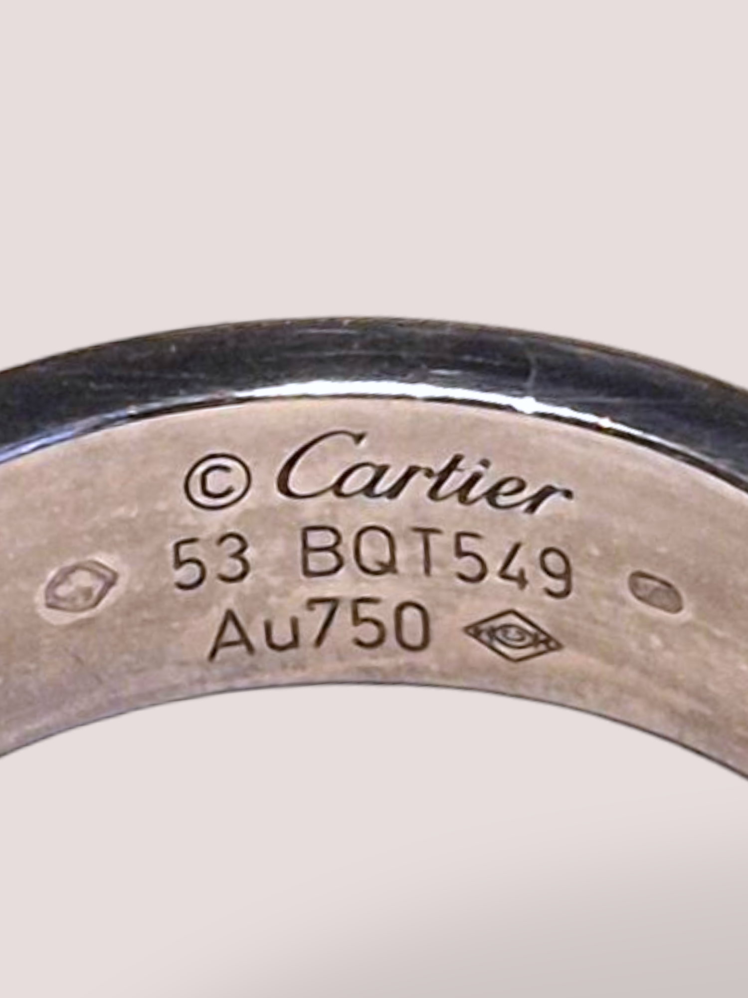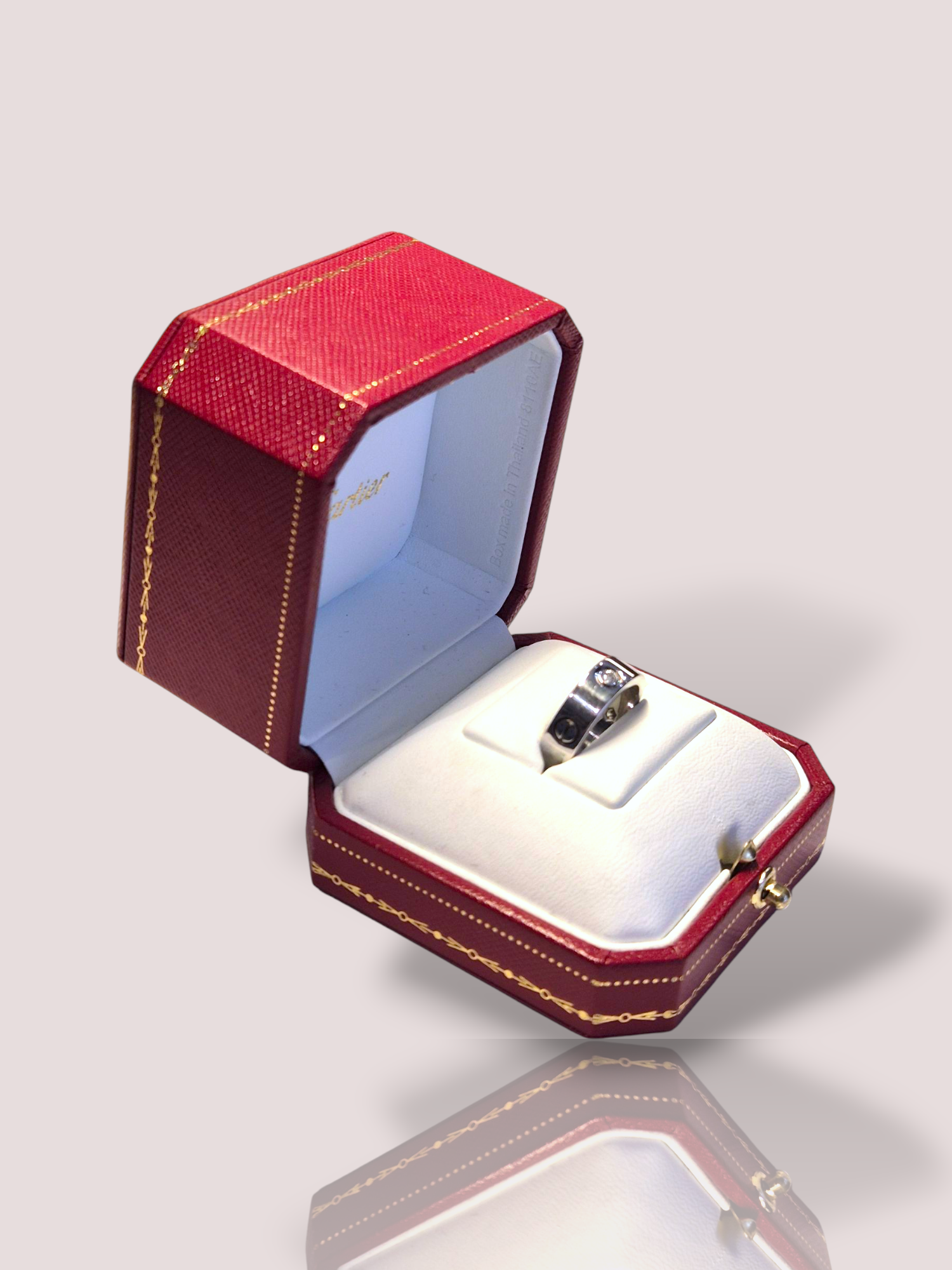 Deze Vintage Cartier Love ring heeft 3 diamanten en is een tijdloos sieraad dat direct luxe toevoegt aan elke outfit. Draag deze ring dagelijks als een subtiele en stijlvolle toevoeging aan je look, of combineer het met andere ringen voor een opvallende statement. Het fijne ontwerp maakt het gemakkelijk te combineren met andere sieraden. Maak je look compleet met deze prachtige ring! Deze ring is 0,5 cm hoog.