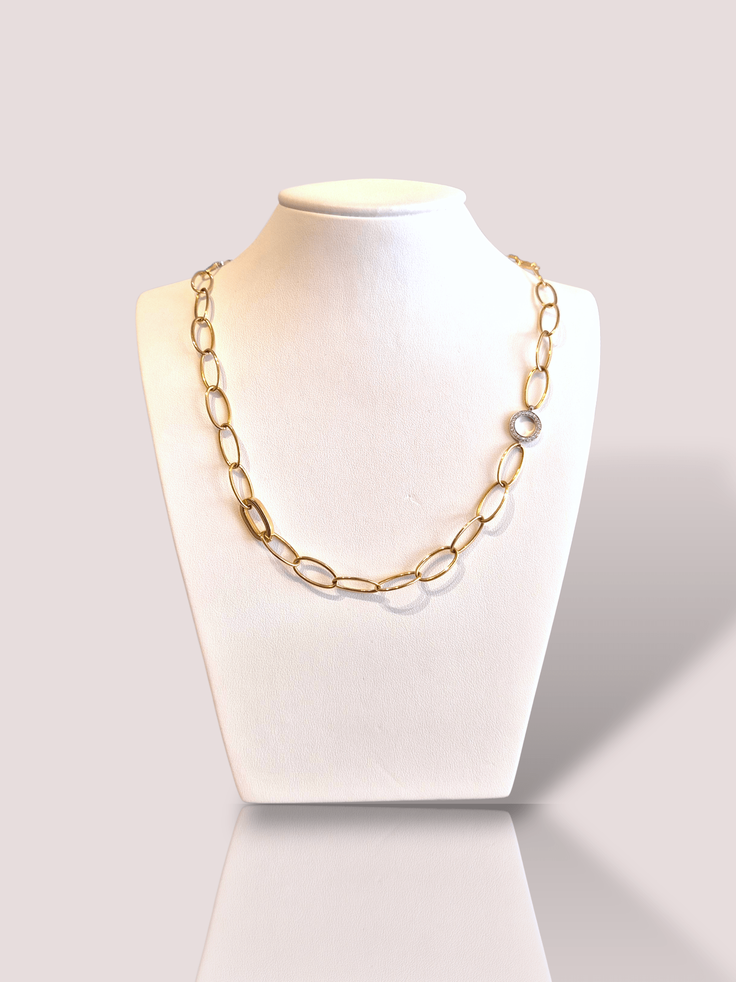 Deze prachtige Vintage Chantecler collier is gemaakt van roségoud en bezet met schitterende diamanten. Het tijdloze ontwerp maakt het een perfecte toevoeging aan elke outfit, of het nu chic of casual is. Draag het als statement piece bij een elegante avondjurk of voeg wat glamour toe aan een alledaagse look. Dit collier zal zeker de aandacht trekken en je laten stralen. De ketting heeft een lengte van 60 cm.