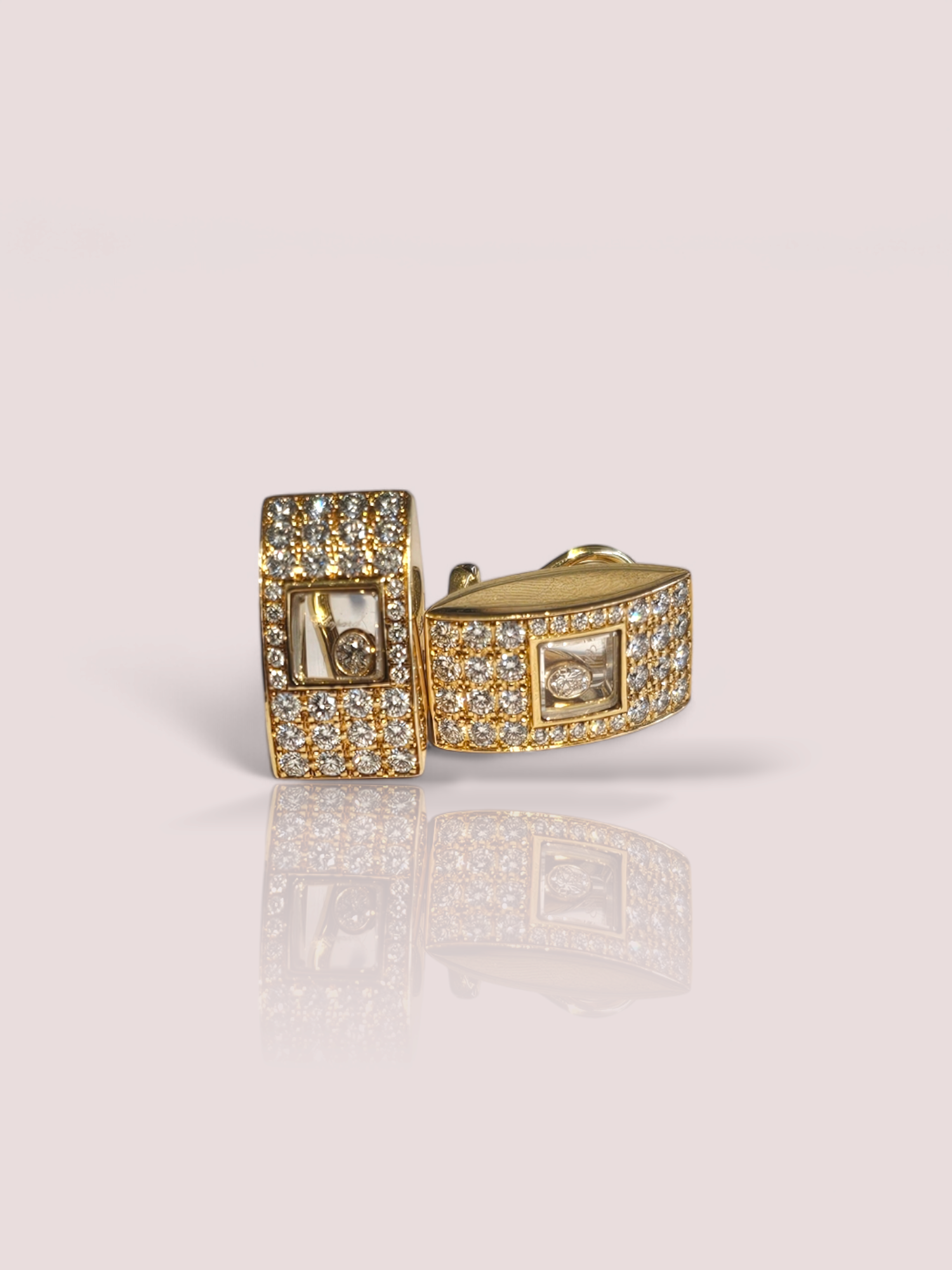 Deze prachtige Vintage Chopard Happy Diamonds oorstekers zijn gemaakt van 18k geelgoud en voorzien van glinsterende diamanten die vrij bewegen in een transparante setting. De oorstekers zijn tijdloos, elegant en perfect voor elke gelegenheid. Draag ze als statement piece bij een chique avondjurk of combineer ze met een casual outfit voor een vleugje glamour. Een absolute must-have voor elke sieradencollectie! De oorbellen zijn 16 mm x 8 mm.