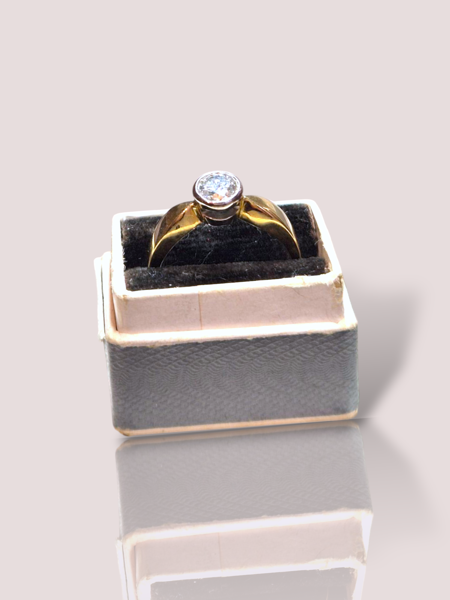 Deze prachtige vintage ring is gemaakt van geel goud met een 0,5 karaat diamant die is gezet in wit goud. De ring heeft een klassiek en tijdloos ontwerp dat perfect past bij elke gelegenheid. Draag deze ring als een statement stuk alleen of stapel hem met andere ringen voor een trendy look. Een absolute must-have voor elke sieradencollectie!