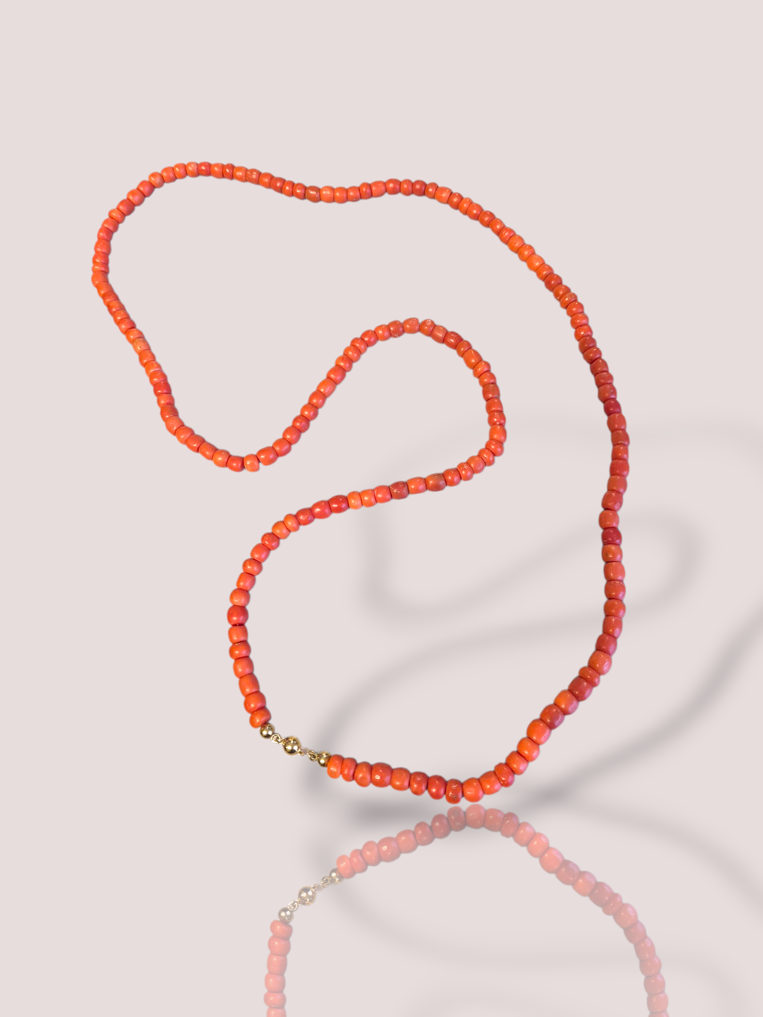 Dit vintage lang bloedkoraal collier van 95 cm met een 18k gouden slotje is een uniek sieradenstuk. Het lange collier heeft prachtige kaasvormige bloedkoralen van 7,1 tot 7,3 mm dikte. Draag het collier elegant op een eenvoudige top of jurk om de rijke kleur van het bloedkoraal te accentueren en een statement te maken.