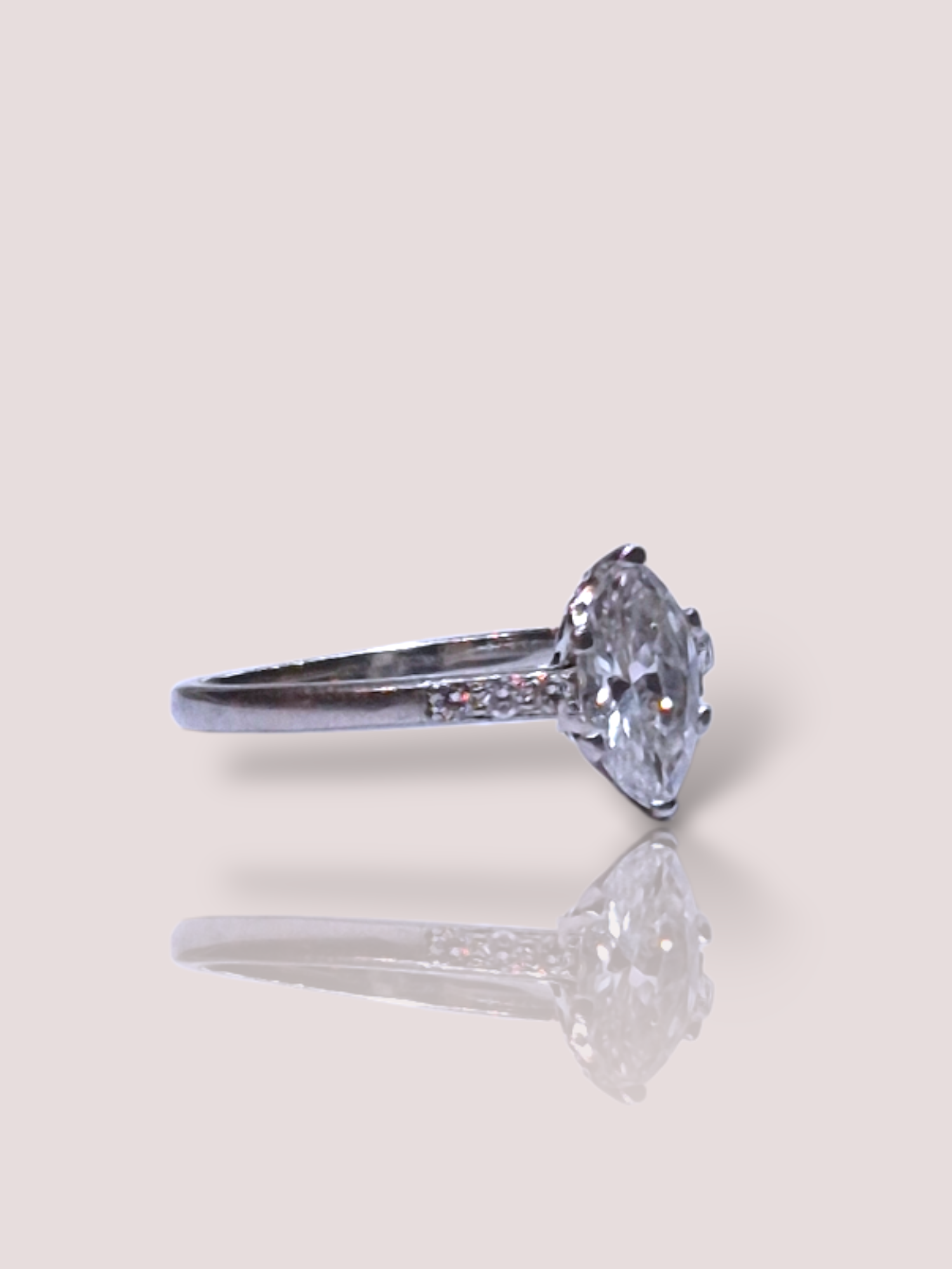 Deze prachtige vintage platina art-deco ring bevat een schitterende marquis geslepen diamant van 0,95 ct. Het is een unieke stijlvolle ring, waarbij in de band nog 0,10ct extra aan diamanten is verwerkt. Draag deze tijdloze ring als een opvallend sieraad bij speciale gelegenheden of om je dagelijkse outfit een luxe touch te geven. Perfect voor liefhebbers van klassieke elegantie.