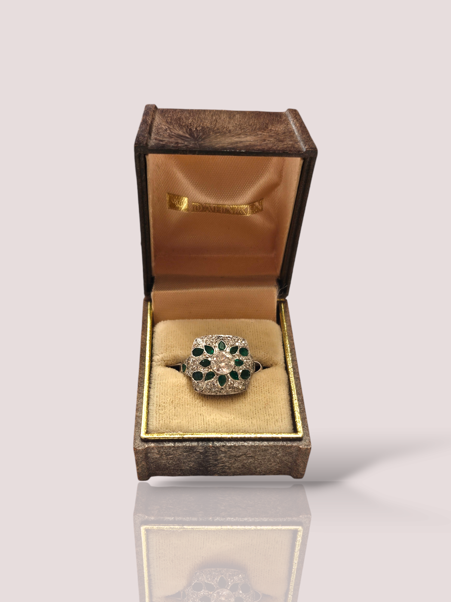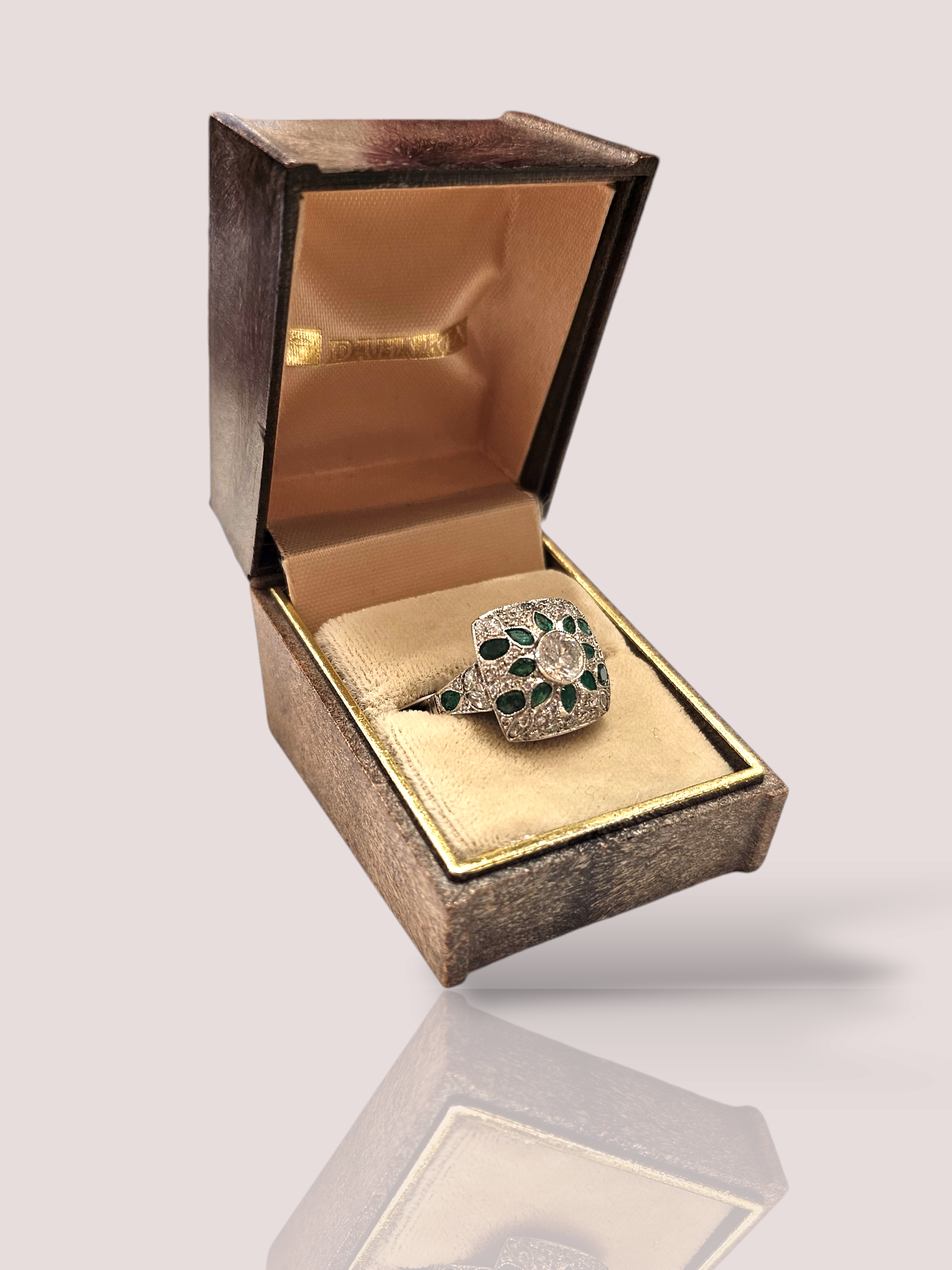 Deze vintage platina Art-Deco ring is prachtig versierd met marquise- en briljantgeslepen diamanten en 14 smaragden. Het is een echte eyecatcher voor speciale gelegenheden en voegt een vleugje glamour toe aan je look. Draag deze ring op zichzelf als statement piece of combineer met andere sieraden voor een gelaagde en luxueuze uitstraling. Perfect voor liefhebbers van vintage en Art-Deco stijl. De center stone is een 0,6ct diamant. De ring kan eventueel op maat vermaakt worden.