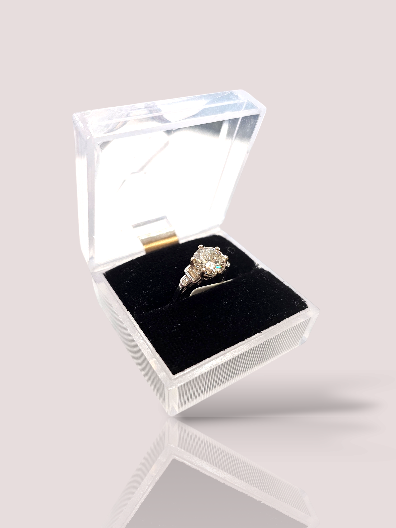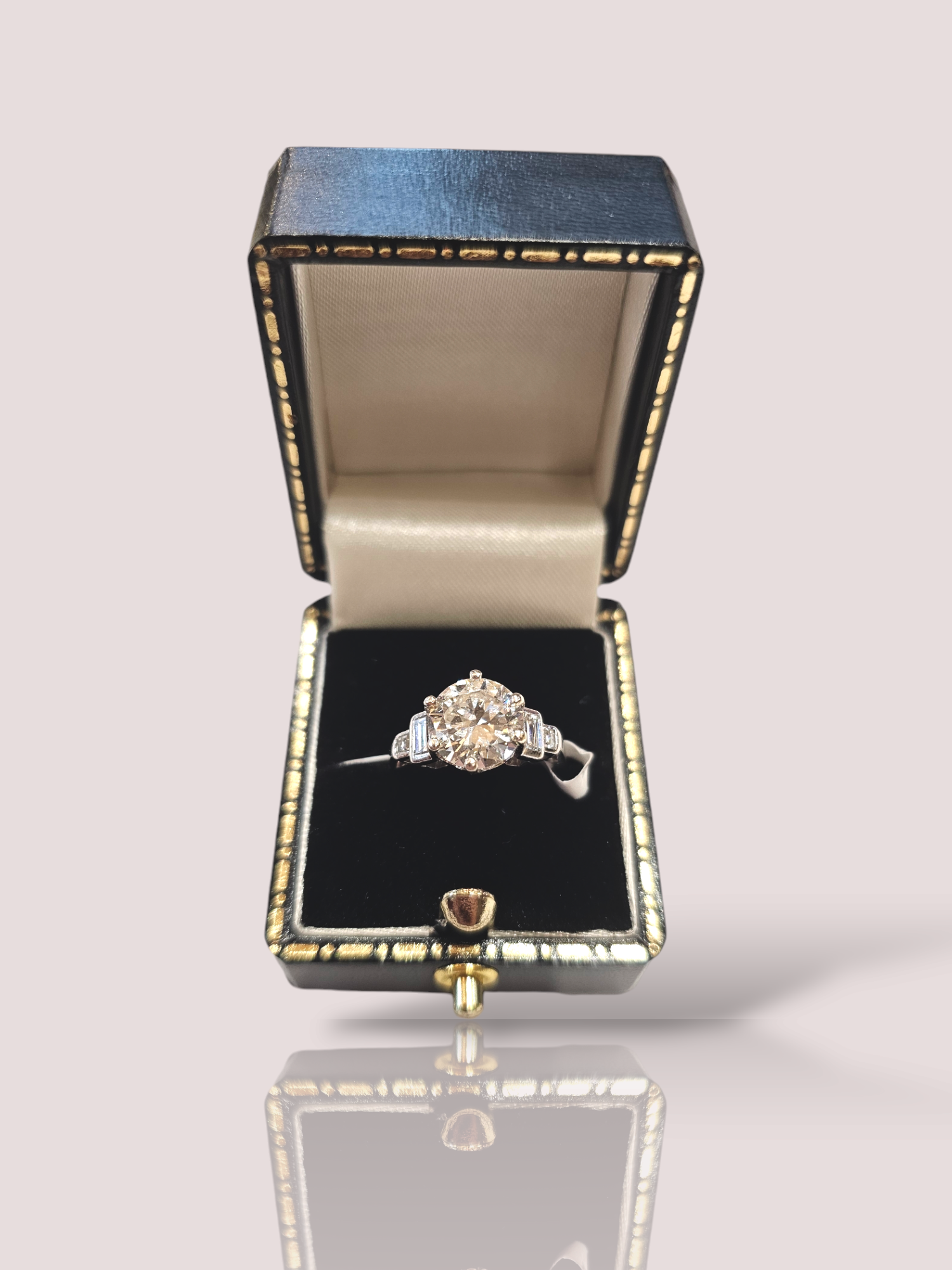Deze prachtige vintage platina solitair diamanten ring is voorzien van baguette geslepen diamanten, wat zorgt voor een unieke en glamoureuze uitstraling. De center stone is maar liefst een 2,15ct diamant! De ring is perfect voor speciale gelegenheden en voegt een vleugje elegantie toe aan elke outfit. Draag deze ring solo voor een minimalistische look of combineer met andere ringen voor een gelaagde stijl. Een ware eyecatcher!
