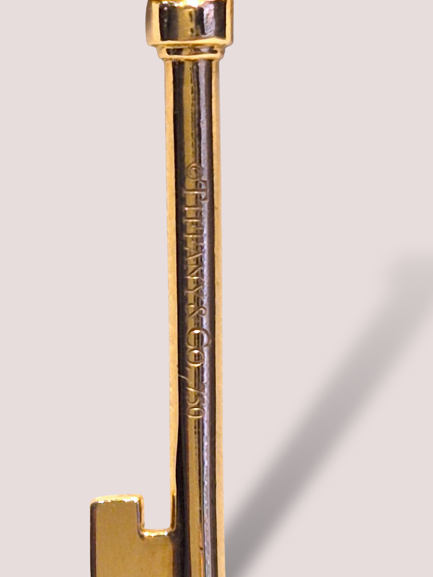 Dit prachtige vintage Tiffany & Co 18k gouden collier heeft de iconische sleutel hanger van 3,5 bij 1,5 cm bezet met een sprankelende diamanten. De gouden ketting is merkloos, de hanger is origineel Tiffany. Het collier straalt elegantie en stijl uit en kan zowel casual als chic gedragen worden. De beste manier om het te dragen is met een simpel wit T-shirt voor een minimalistische look of met een cocktailjurk voor een glamoureuze uitstraling. Voeg dit exclusieve stuk toe aan je collectie voor een tijdloze en luxueuze touch.